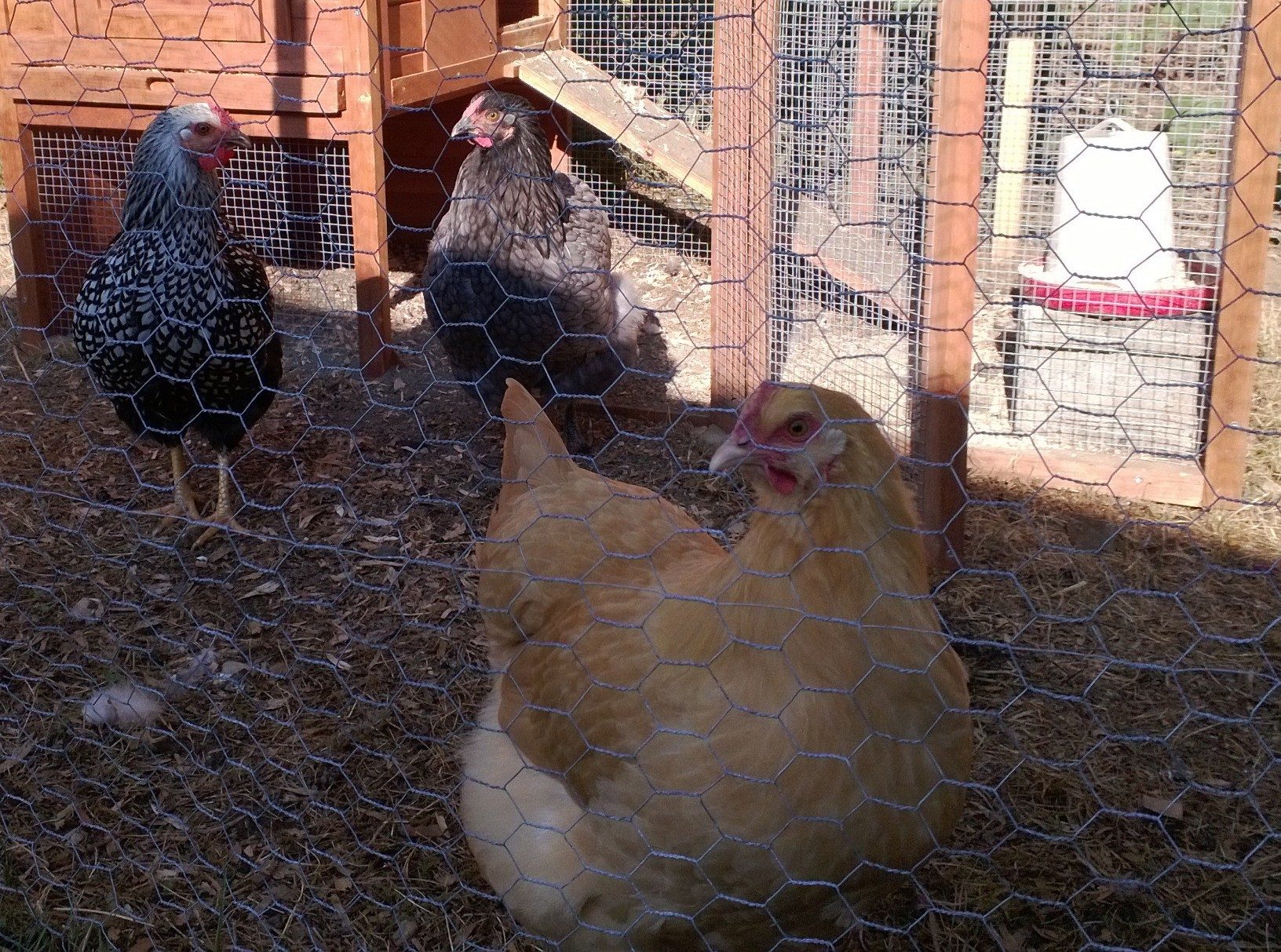 Gossipy hens in back: Look at her showing off her large chest. She thinks she has it all. When farmer finds out she's not laying she'll wish she's skinny like us!