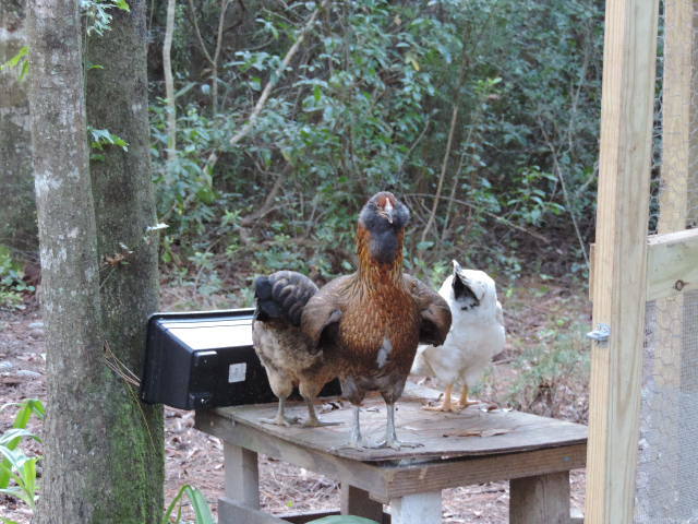 Back two hens: (whispering) Yeah, they didn't even bring any food! What do they think, we'll lay eggs just cause they want us to?? No way!