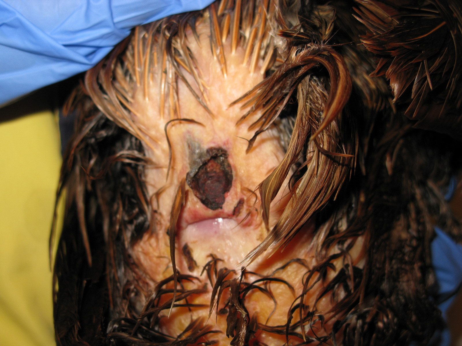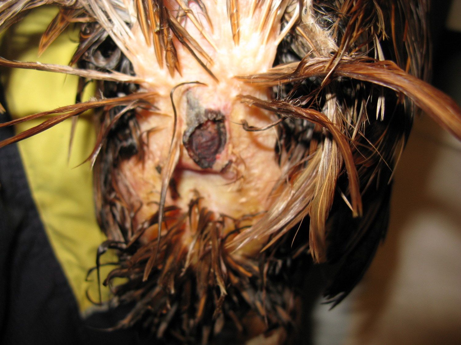 My first thoughts are a burst abscess or possibly a wound (plucked feathers?) that may have had a bit of fly strike and has partially healed.