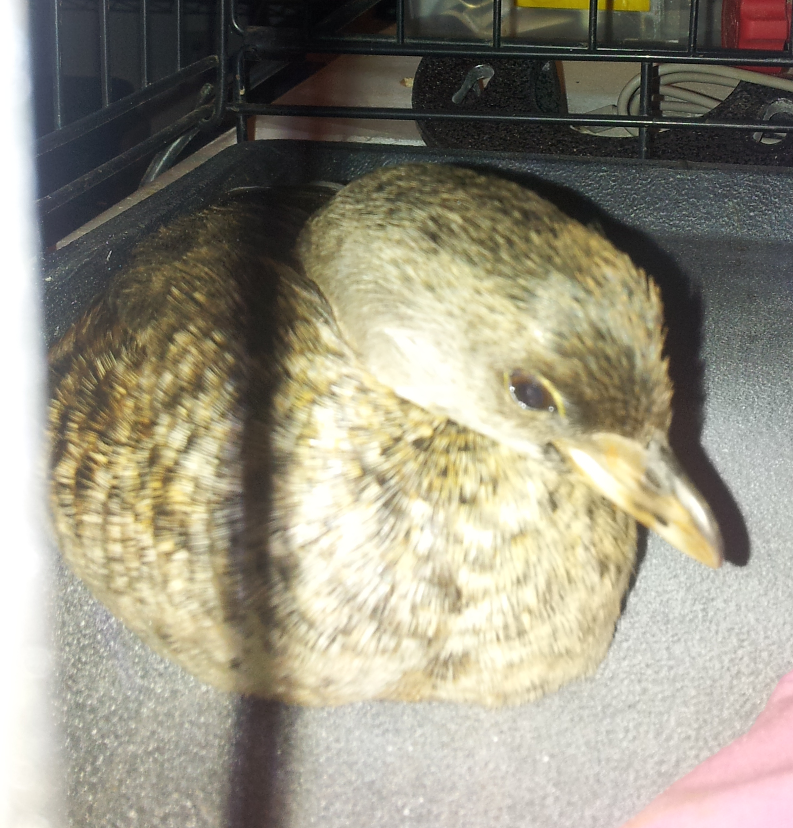 Yes, pied billed grebe. They're carnivores and eat fish and crayfish. But, if you plan on taking her to a wildlife rehabber tomorrow, I wouldn't feed her anything and just make sure she has water to drink and is comfortable. I've never seen them eat any other kind of food other than fish and crayfish.