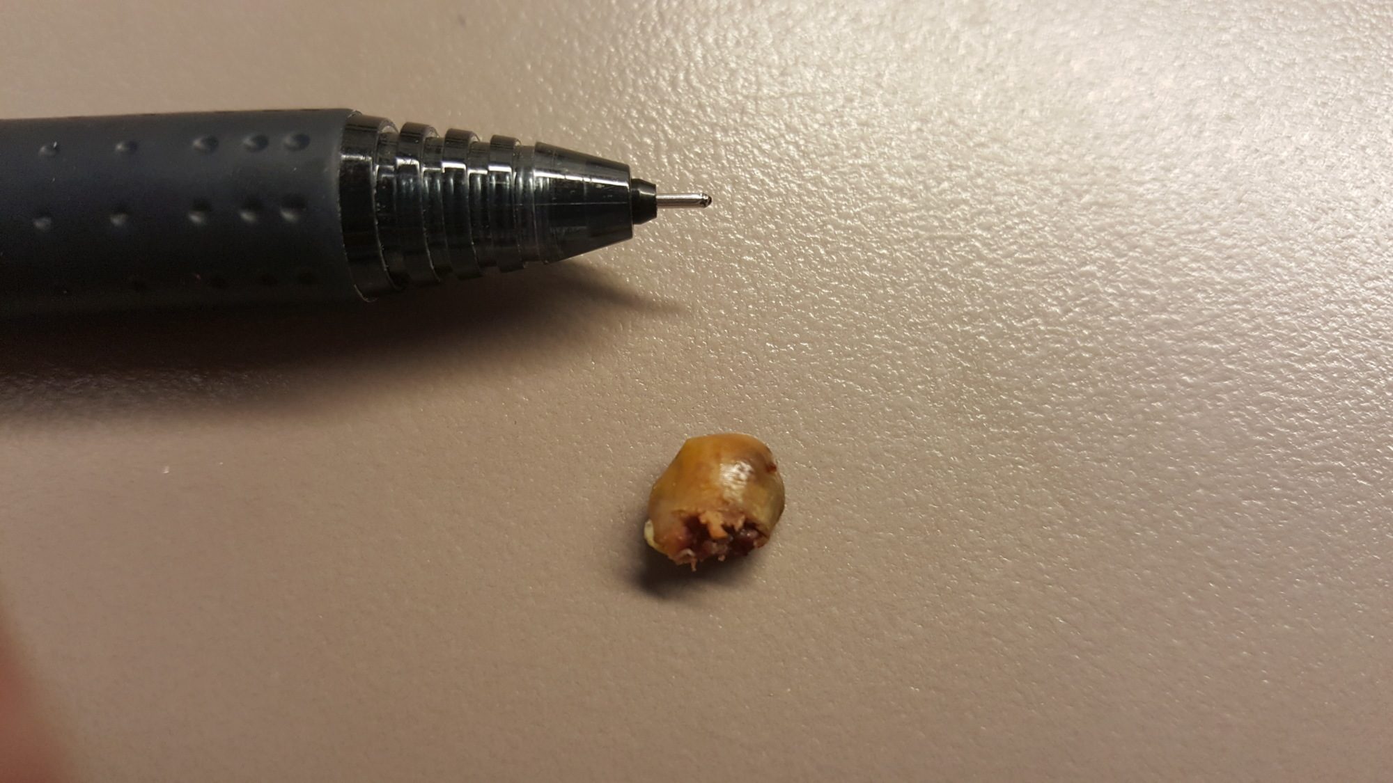 I found this inside of a hard boiled egg. What is it?? It's got a hardish outer shell and the inside is red. In my 10+ years of raising chickens I have never seen this before. Any thoughts? pen shown for size reference...