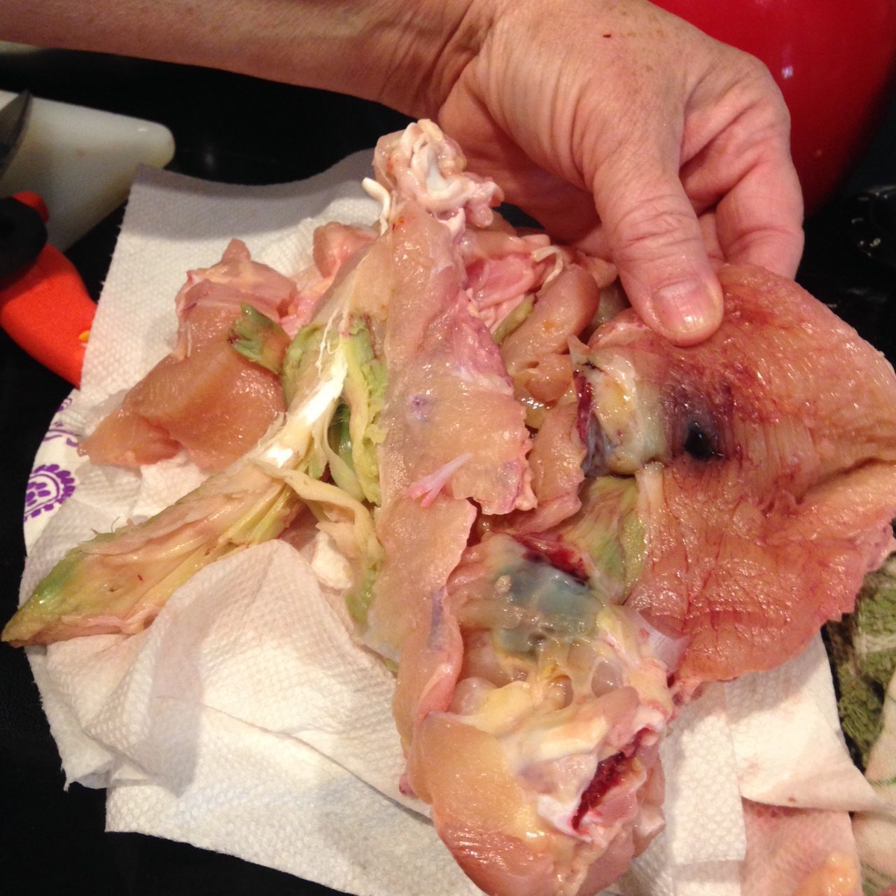 Question: Has anyone ever seen this in butchered birds? THIS IS NOT A BRUISE, NOR IS IT AN ORGAN, NOR IS IT BILE STAINED FLESH FROM SLAUGHTER. My birds are handled gently, they do not roost they don't jump down from anything and bust their breasts. Appreciate sharing your knowledge if you know what this is. It was found immediately behind the breast keel bone. It was a long cigar shaped green shaft of meat embedded in the breast flesh.