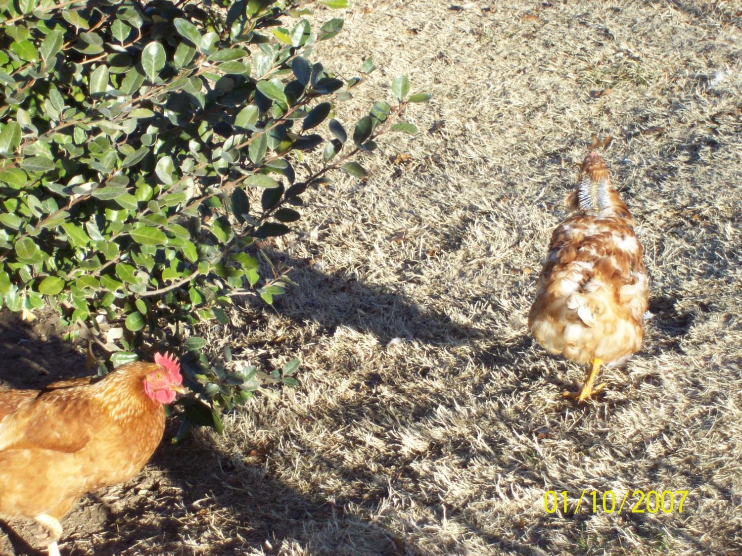 The first hen is fine (the one on the left). The hen that is in front looks awful. Looks to me like somewhat is pecking at her. But I have no rooster. I have 3 ducks, 3 bantam hens, and 5 guineas. I afraid I will lose another bird. We lost a large rooster the same way last summer. And now here we go again.