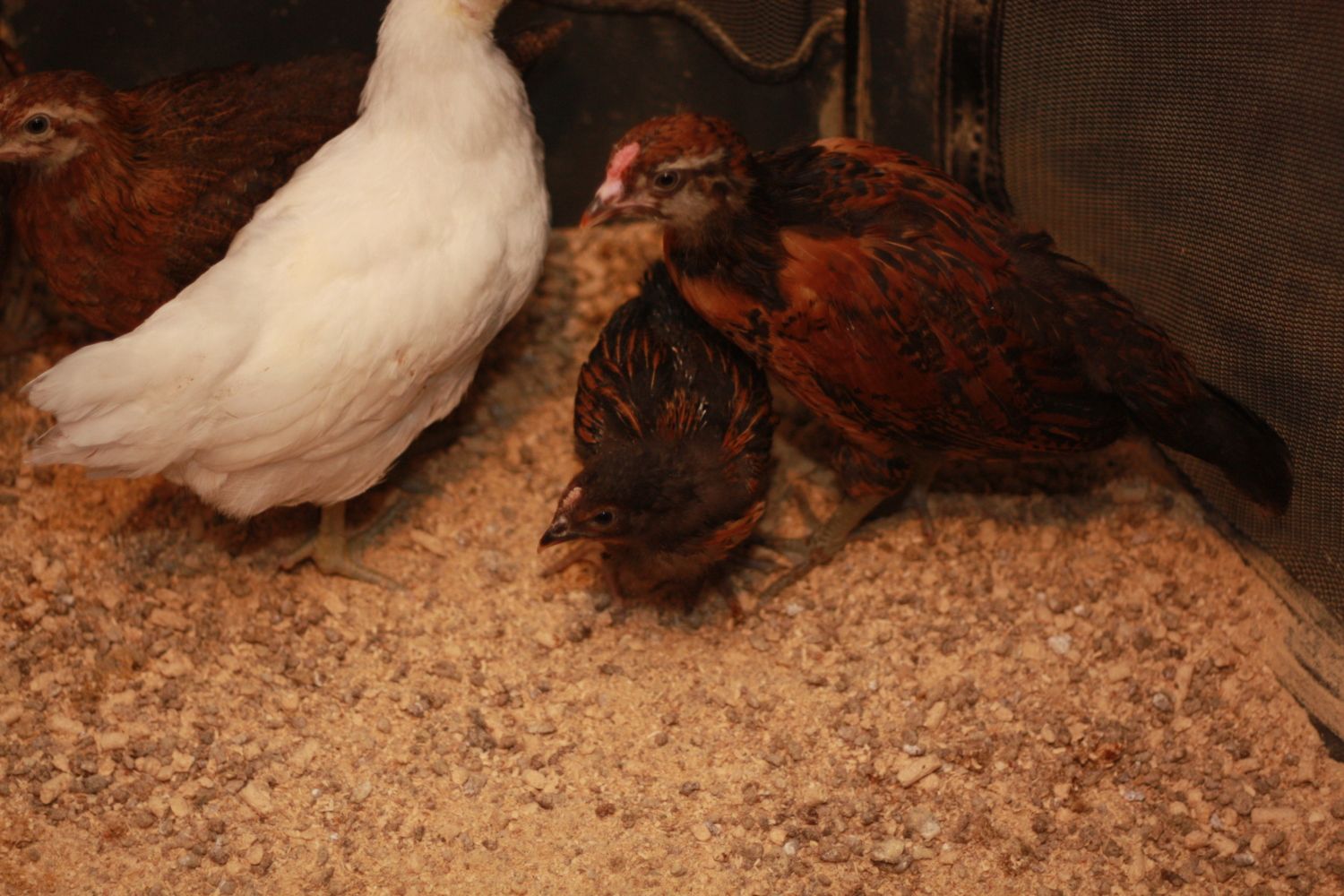 I agree.Can't help ya on breeds, but the little one and your EE seem to be Roos.