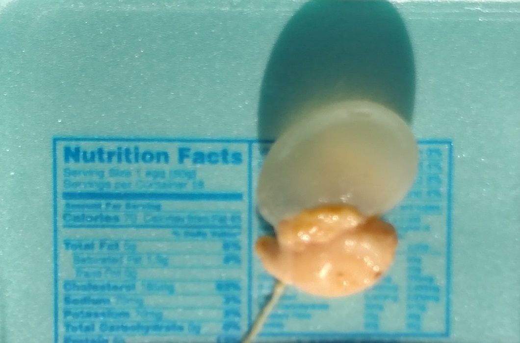 Found this in the nest box, and I haven't seen anything like it. It is relatively solid similar to thick jello. The 'egg' part is just over an inch and slightly transparent, the thing attached to it reminds me of fat and has a stringy thing attached.