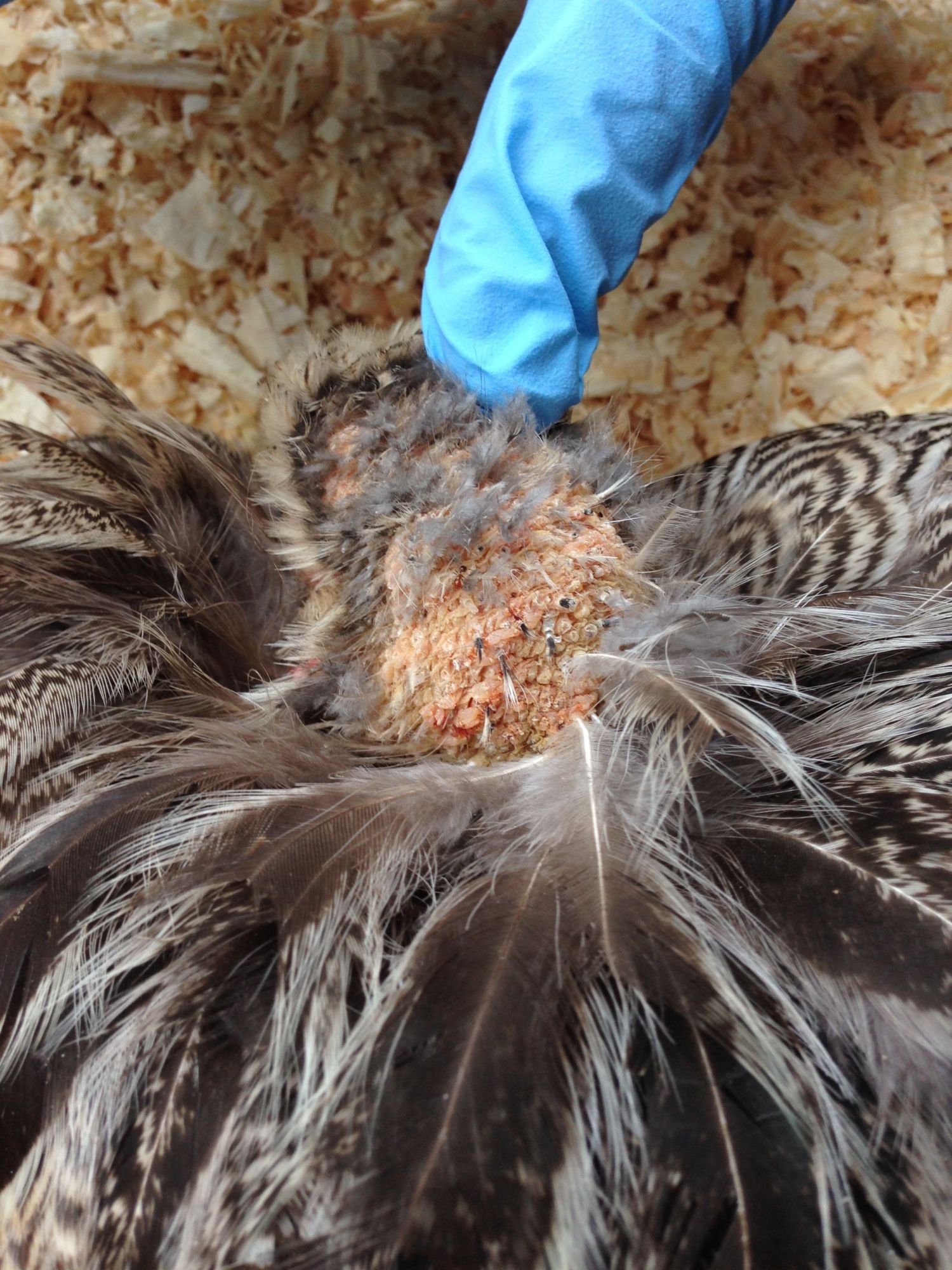 The depluming itch mite is another quite small (~0.5 mm) that infests domestic birds such as chicken, pheasant, pigeon and goose. However, it is not as frequent as other mite species and prefers warmer climates. It does not suck blood, but burrows into the skin along the shafts of the feathers, which easily break. Affected birds bite themselves vigorously and may pull out their own feathers. It can also cause cannibalism among the birds. The lifecycle can be completed in about one month. Transmission is by direct contact between the birds. Infestations in modern operations are rare, more frequent on free ranging and backyard birds. For diagnosis a a few feathers close to a lesion can be pulled out and examined under the microscope.