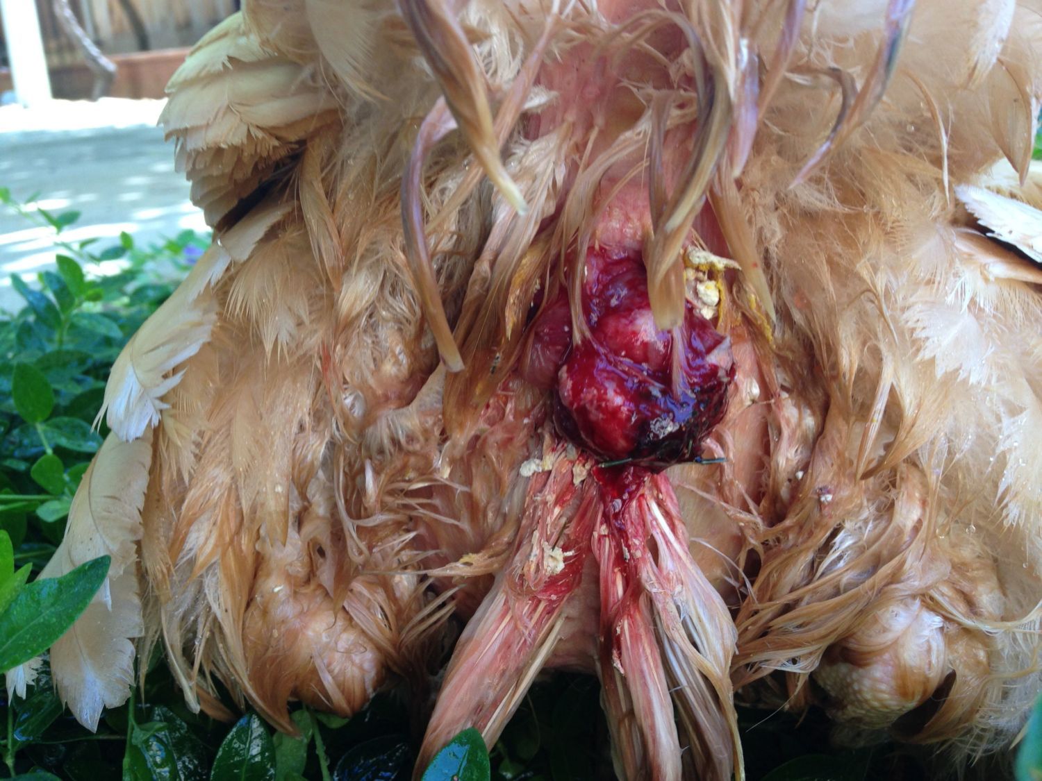 Treatment: If you see portions of your hen’s cloaca protruding through her vent, please be sure to separate her, as she may be a target of pecking/cannibalization. Withhold feed--at least temporarily. While this sounds cruel, withholding feed for a day or two can cause a break in laying for your hen which can give her stressed vent/reproductive tract a much-needed break. If you do withhold feed, it can be a good idea to provide a vitamin supplement in her water in case the problem is caused or exacerbated by a nutritional deficiency. You can don a latex or non-latex glove, and lubricate with petroleum jelly or an antibiotic ointment (be sure the ointment does not contain painkillers ending in -caine--they are not good for chickens). Use a finger to gently push the protrusion back inside the vent. Preparation H can help a small prolapse. If the prolapse has been pecked or “picked out,” it’s best to consult a vet. Do not treat the pain from a picked vent with an aspirin solution, either: that can thin the blood and cause additional bleeding. Consult a vet if you think your hen needs treatment for pain.