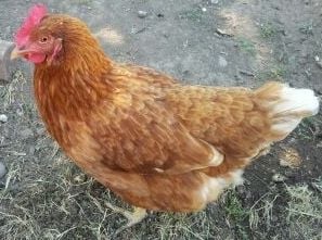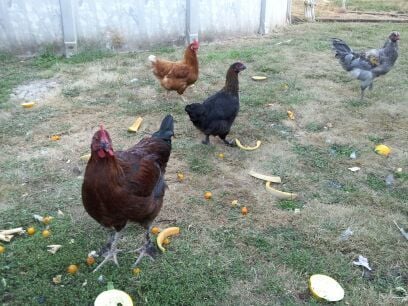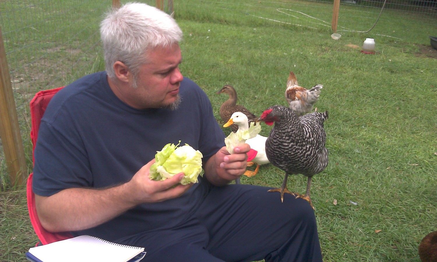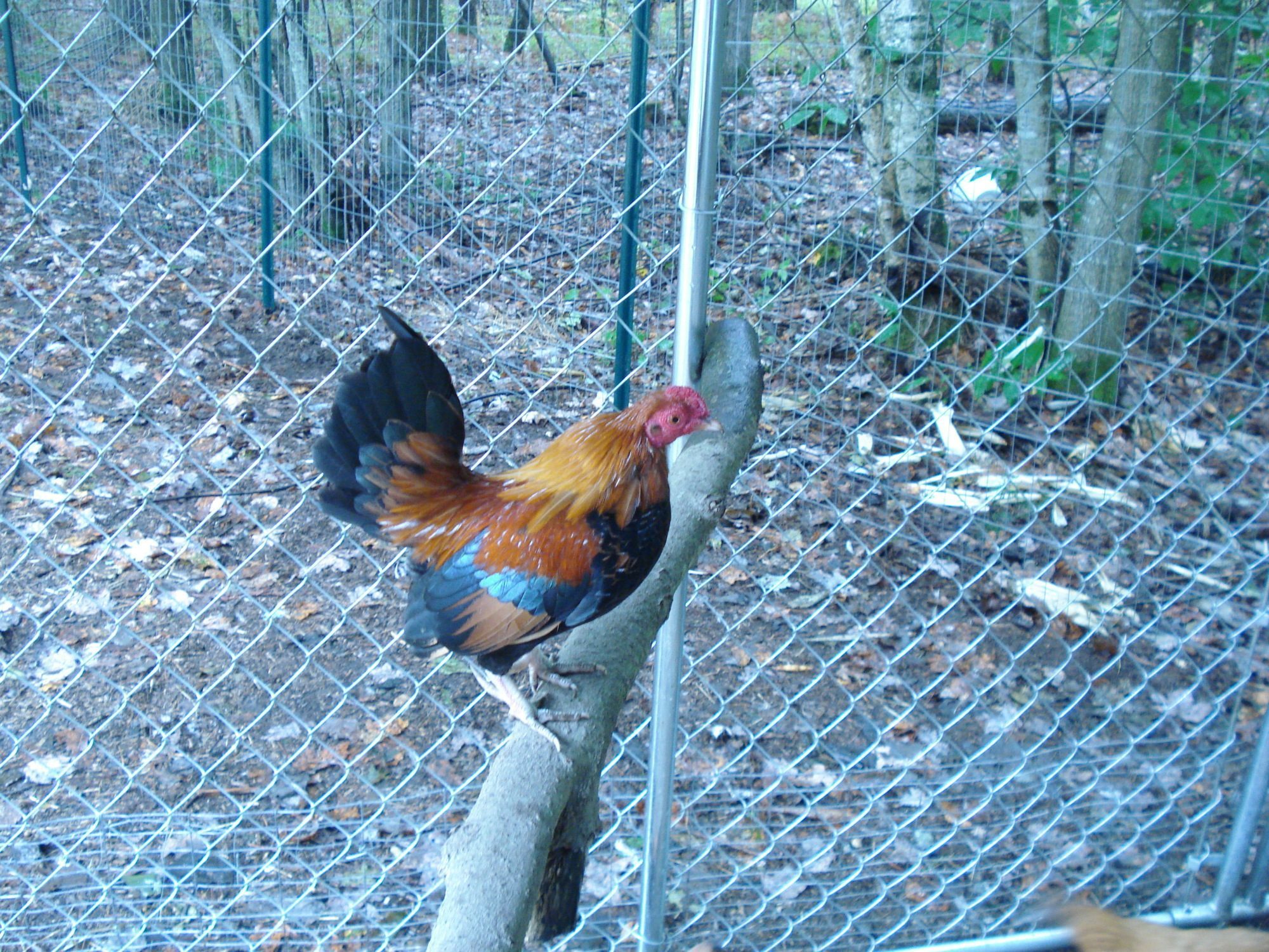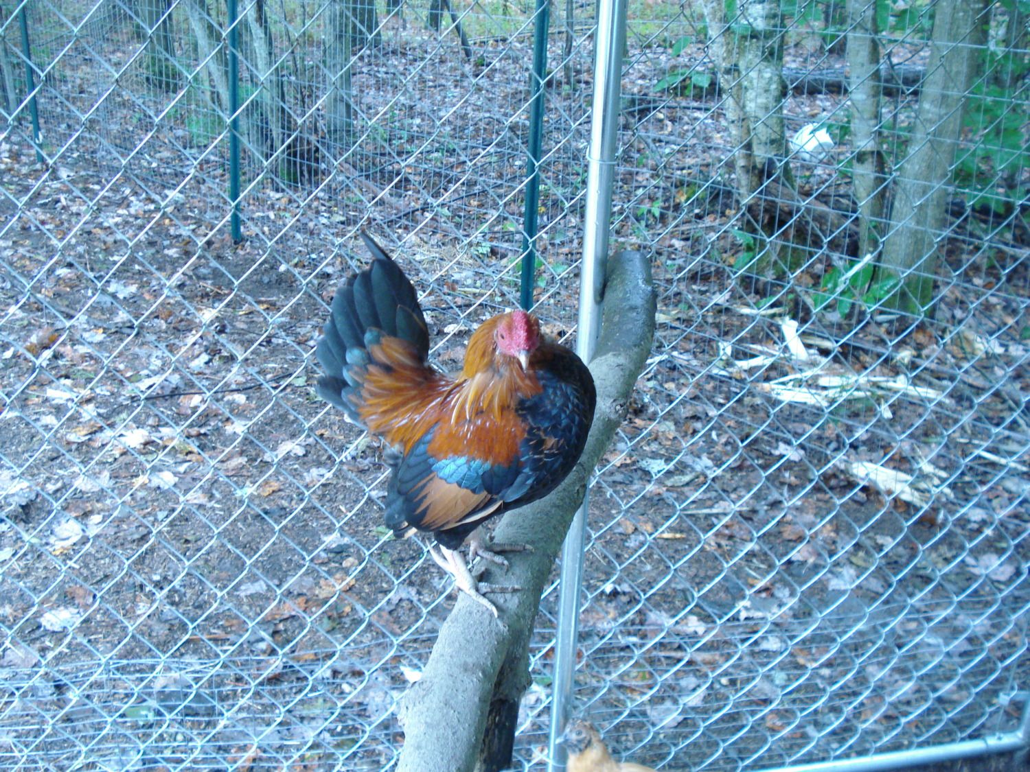 Ours is a Dominique named Pepper. Tonight hubby took out some lettuce to give to the ducks and chickens. Just as soon as his bottom hit the chair Pepper jumped right up on his leg and went to town on the snack. She loves to get scratched on her neck just above where her wings attach to her body. She will droop her head and nearly fall over asleep. She truly believes she should get special treatment even though she is not head of the pecking order.