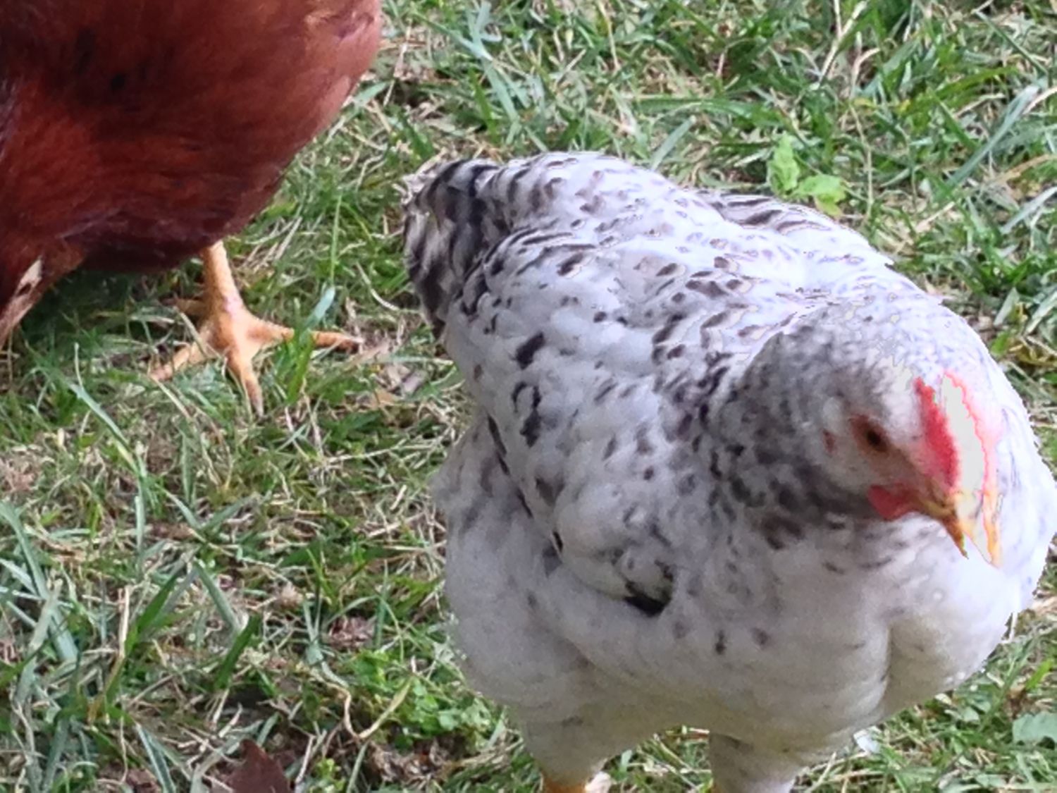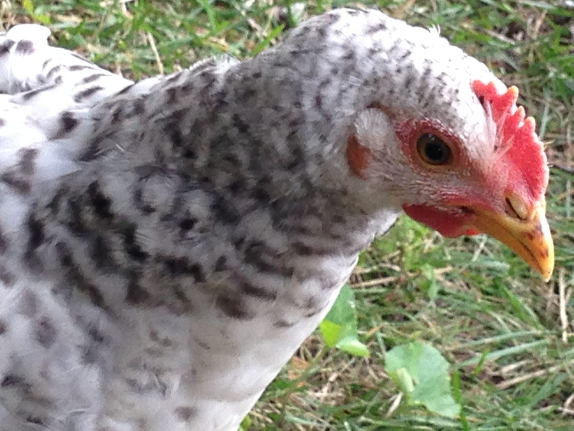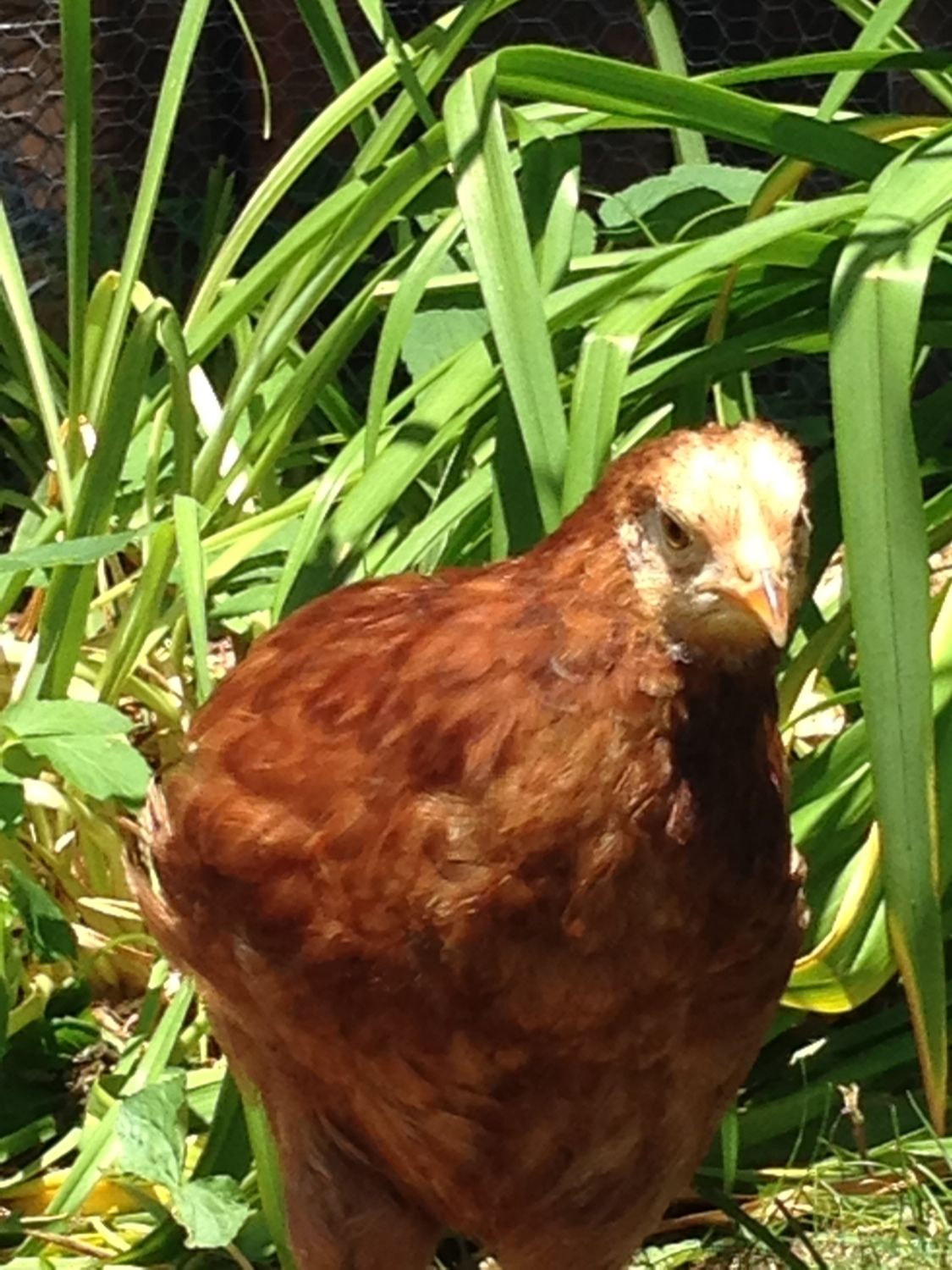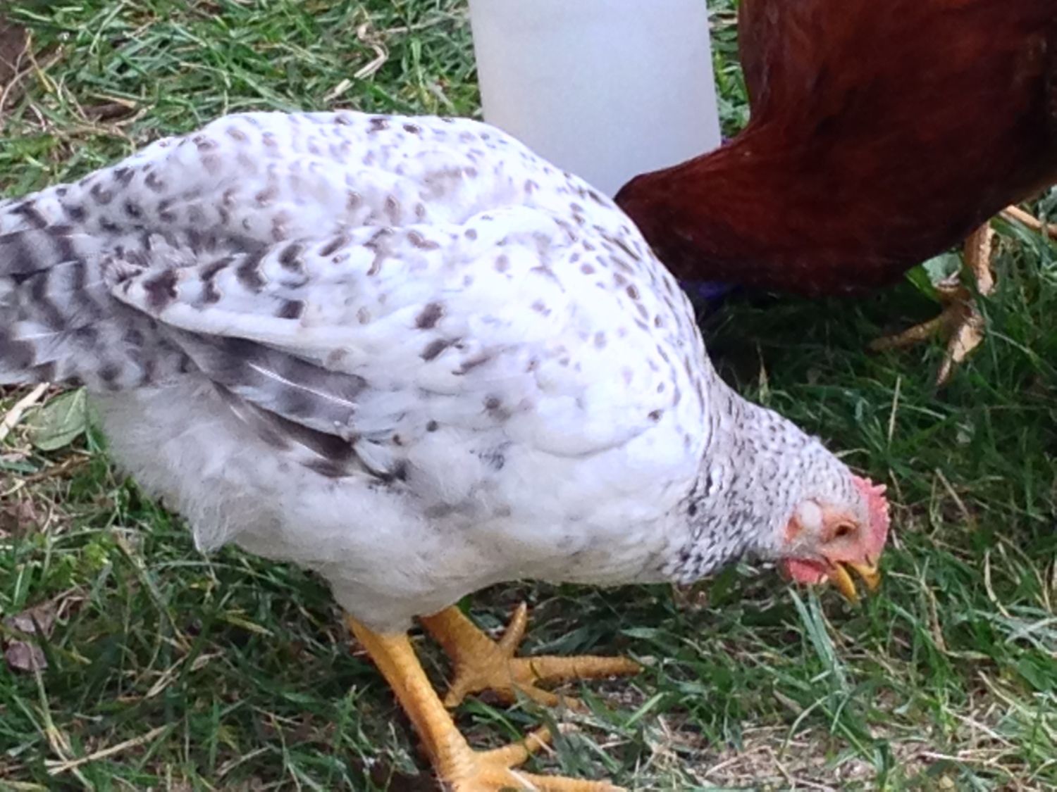 unfortunately you can not see in the pic but he is get red feathers on his head, neck and hackles. Pretty soon he is going to look like a crimson tide washed over him. The lady that sold them to me only has the better breeds Rhodebars, Dominiques, Flower hens, Marans, that kind of thing... no BSL, RSl, Leghorn As far as Omelette she is 1/3 the size of RSL and is the same age. Additionally, I will have to get a "good" pic of her when she stands pretty. I swear if she were smaller I'd think she was a Serama, with her pretty pose... Her back turns into a complete U. And her tail fans out ... quite pretty actually. And she doesn't schlep around the yard like BSLs I have. And unfortunately you can't see in the pic but all of her feathers have a blue black spot on the end.