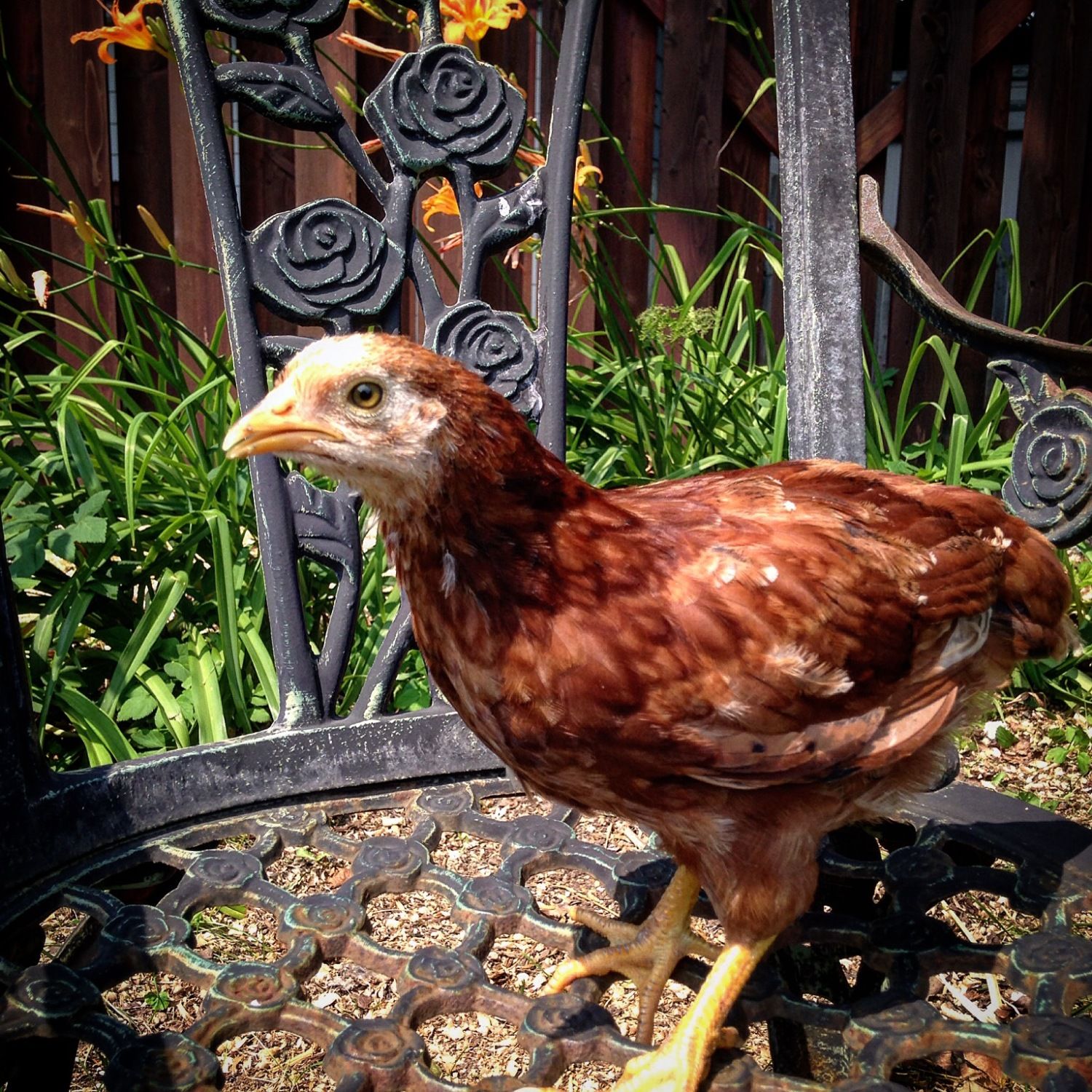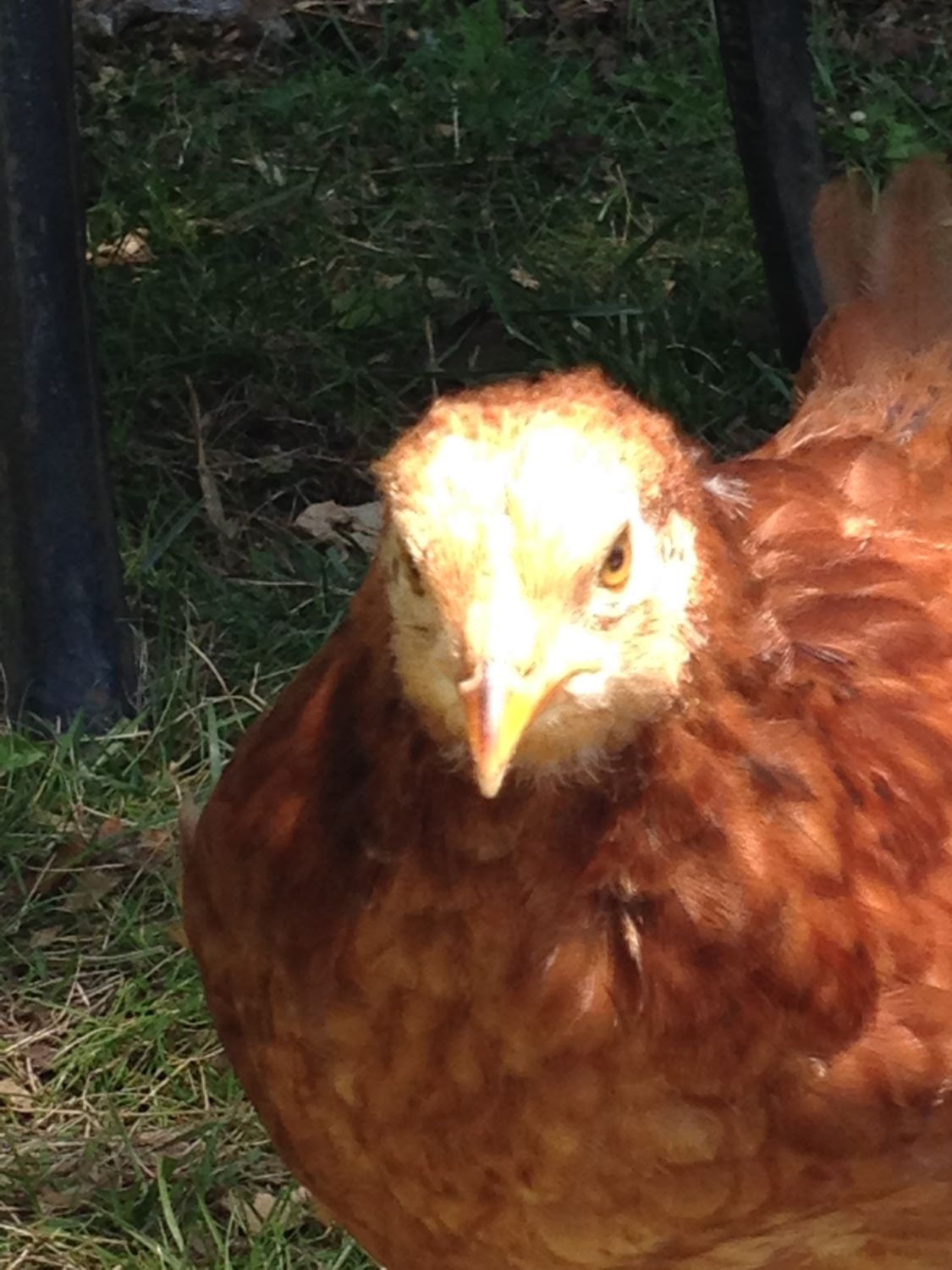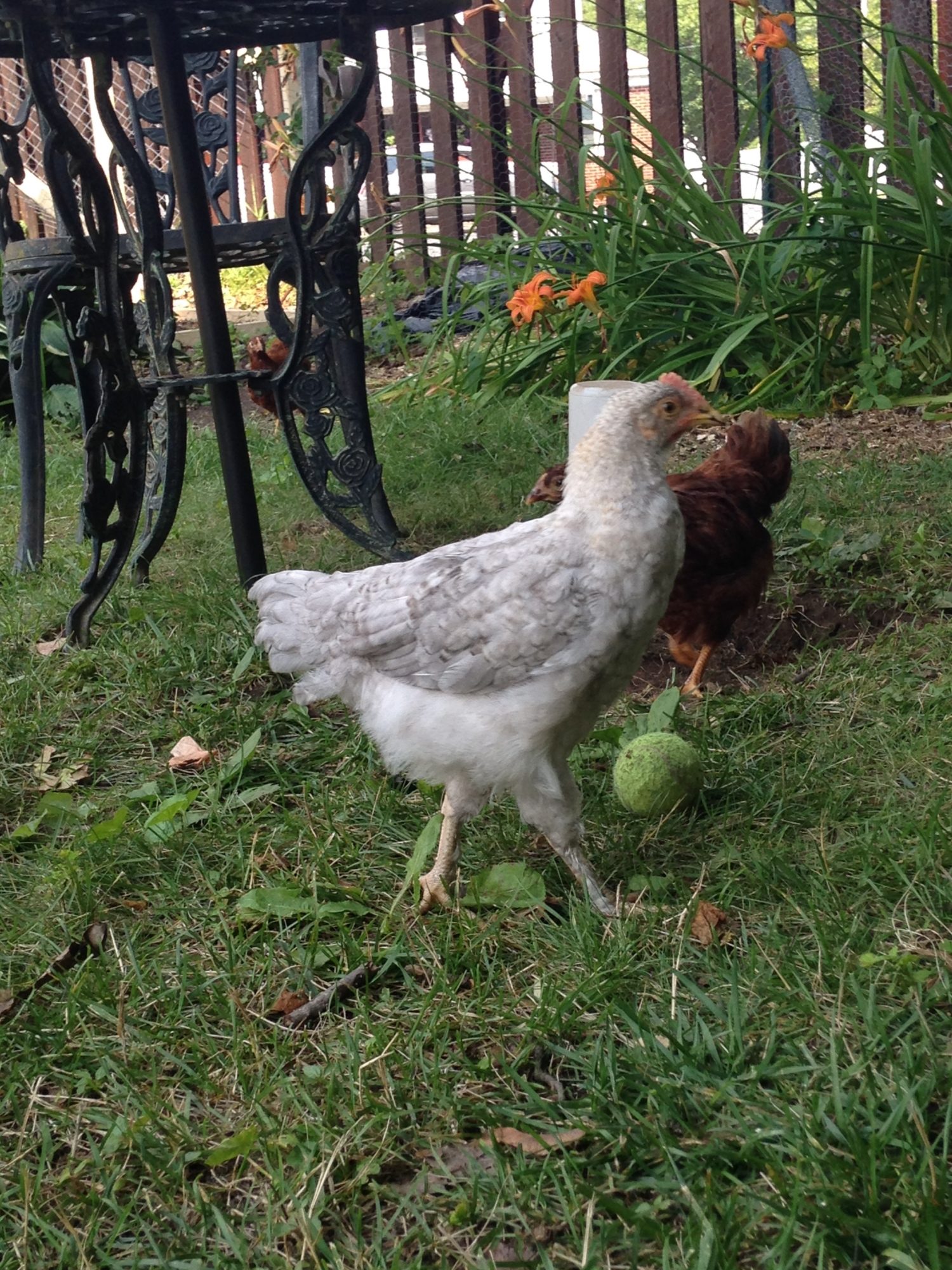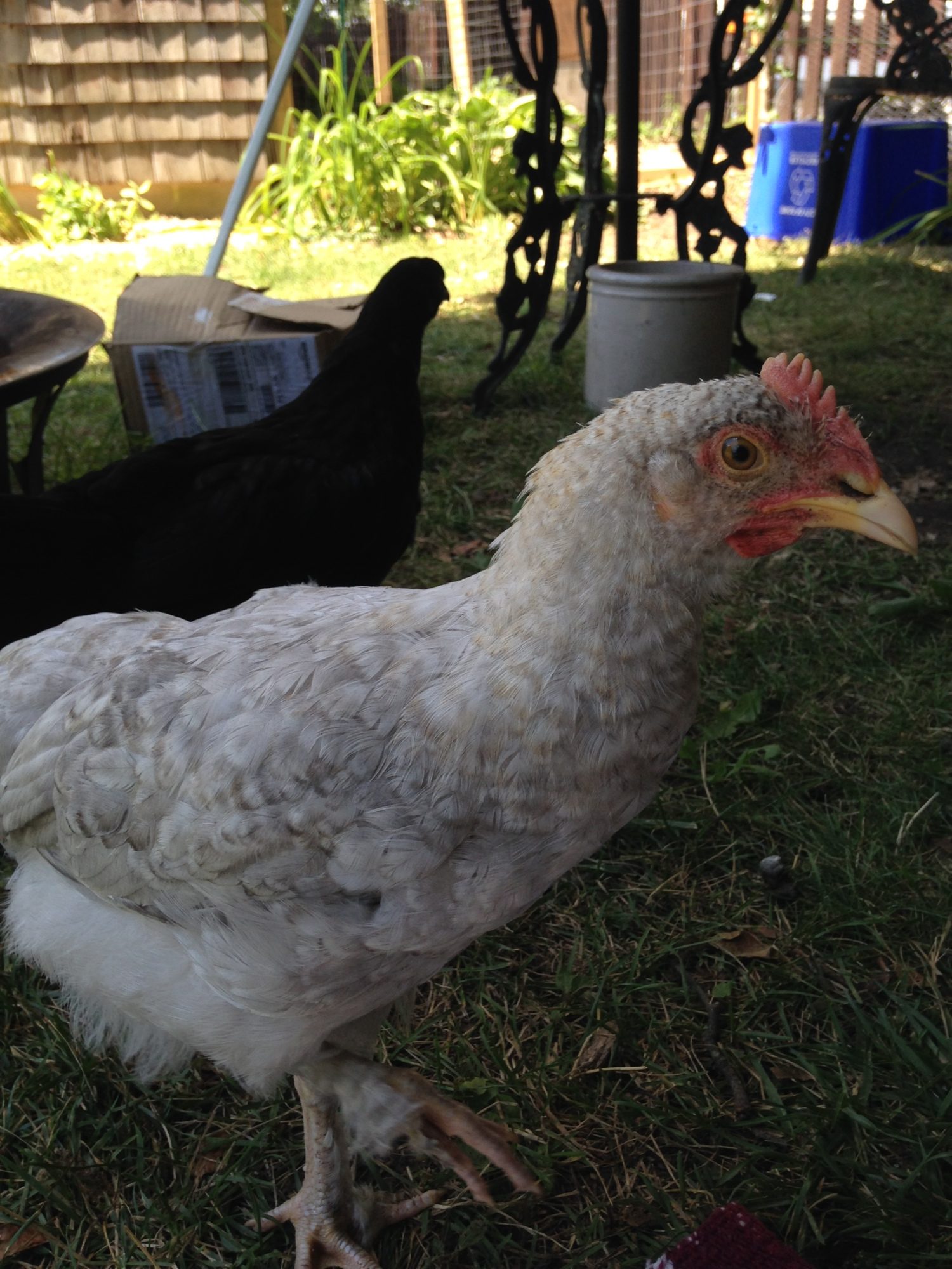 unfortunately you can not see in the pic but he is get red feathers on his head, neck and hackles. Pretty soon he is going to look like a crimson tide washed over him. The lady that sold them to me only has the better breeds Rhodebars, Dominiques, Flower hens, Marans, that kind of thing... no BSL, RSl, Leghorn As far as Omelette she is 1/3 the size of RSL and is the same age. Additionally, I will have to get a "good" pic of her when she stands pretty. I swear if she were smaller I'd think she was a Serama, with her pretty pose... Her back turns into a complete U. And her tail fans out ... quite pretty actually. And she doesn't schlep around the yard like BSLs I have. And unfortunately you can't see in the pic but all of her feathers have a blue black spot on the end.