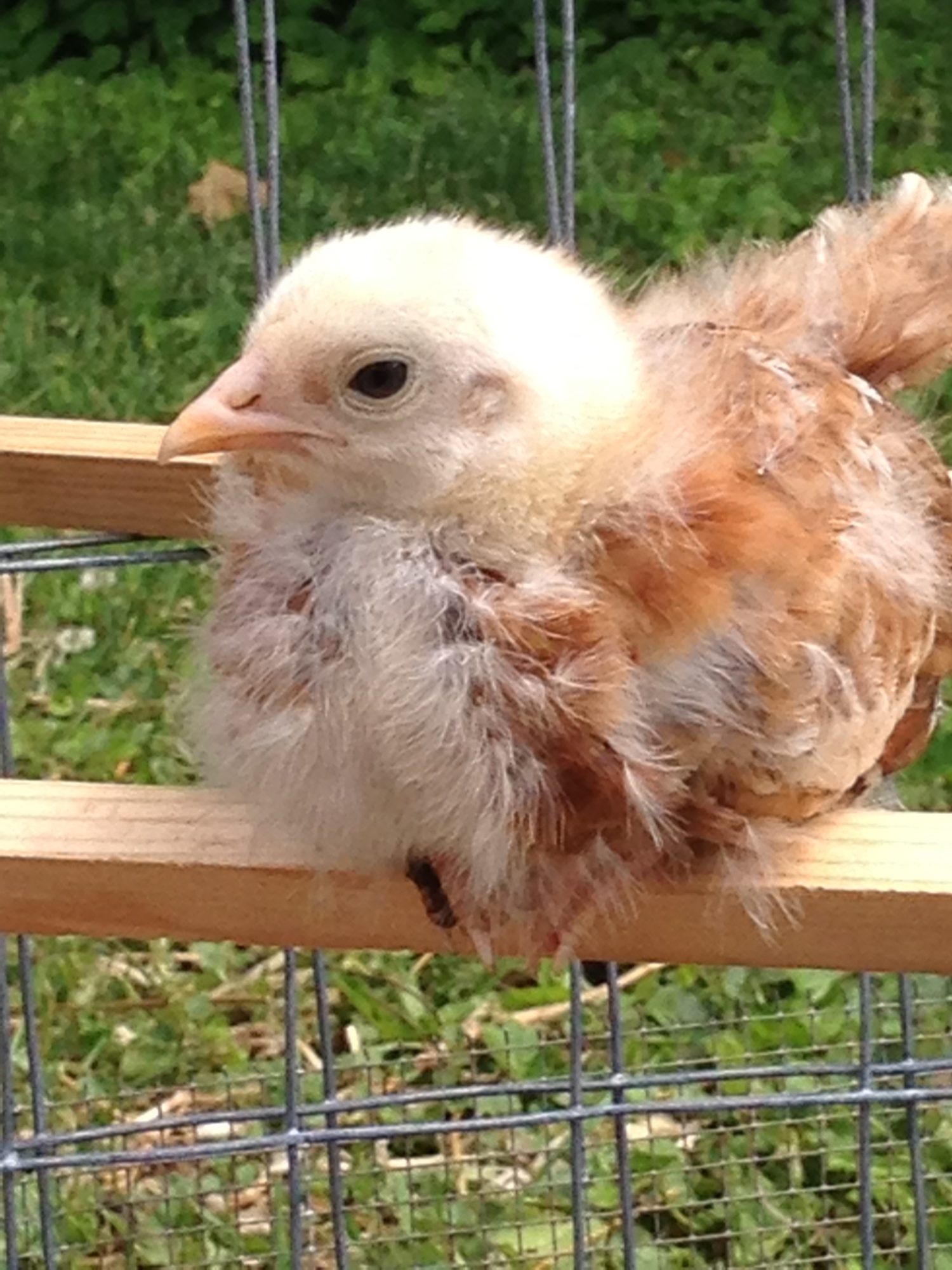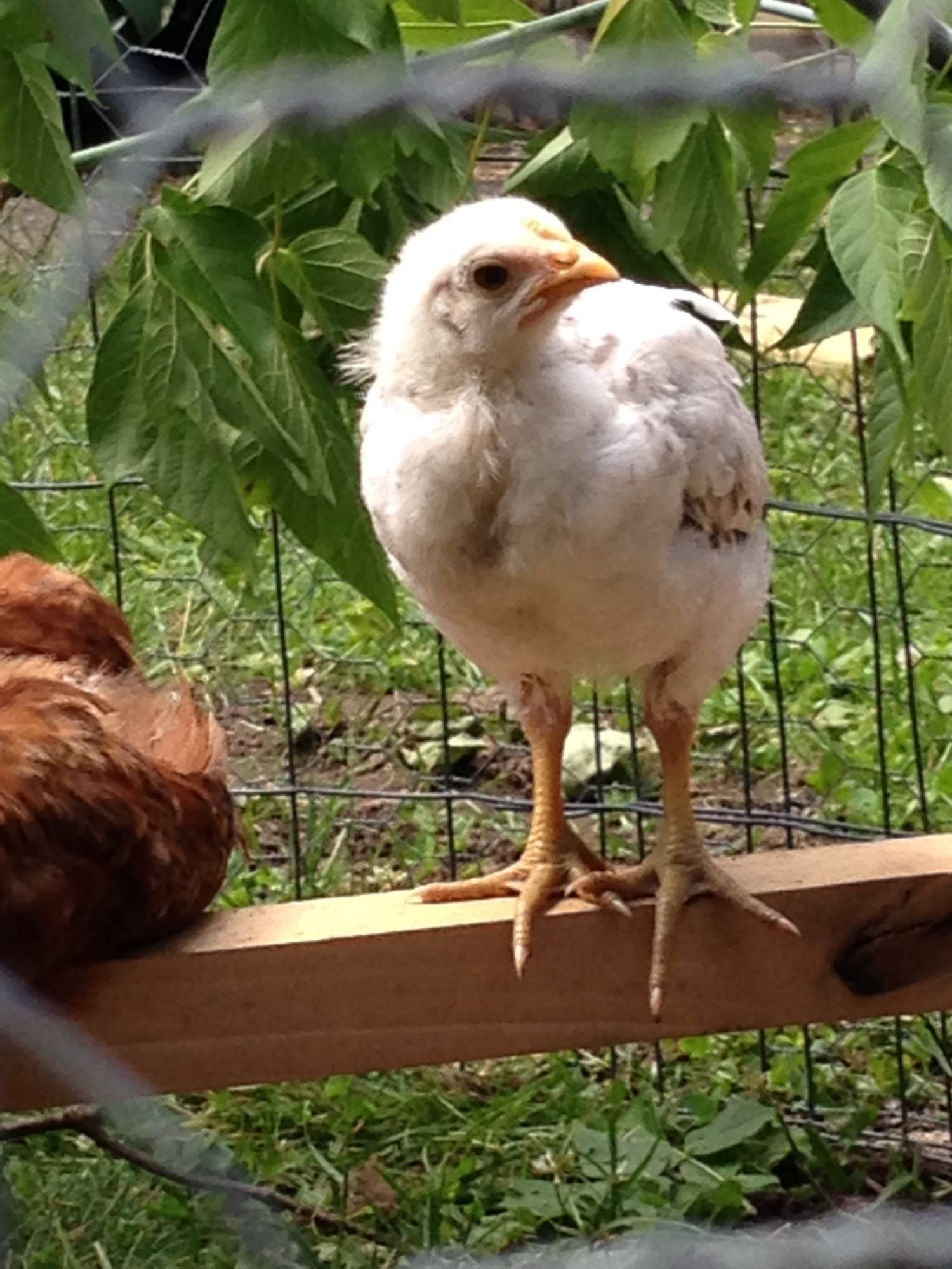 This bird a Roo, is flighty, screams is head off if he is handled. His head is very triangual, has pink feathered feet and beak. He is getting brown feathering in his neck, at the hackles at this point. Marans X Rhodebar???