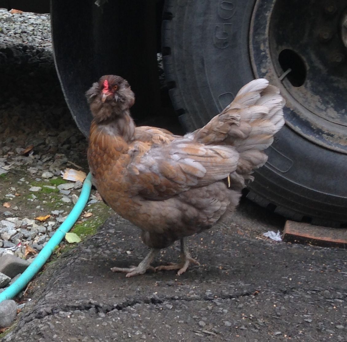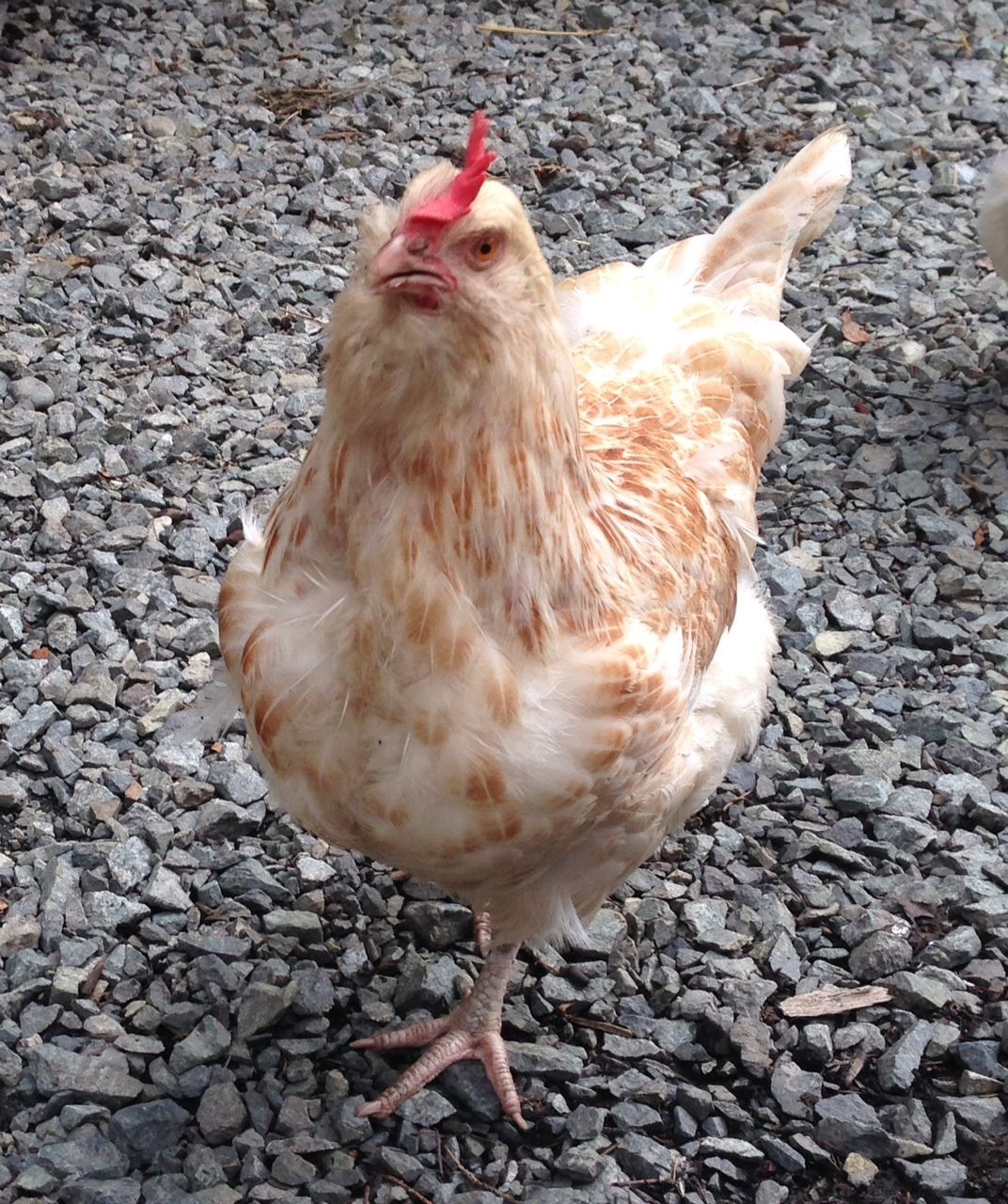 Most of our chickens were "rescued" from people that didn't want them anymore, so I don't know what kinds I have. Any help is appreciated. Our rooster, Ginger, is the frizzled bantam (we were surprised when she turned out to be a rooster!)Mixed breed, possibly with some Faverolles somewhere in her ancestry.