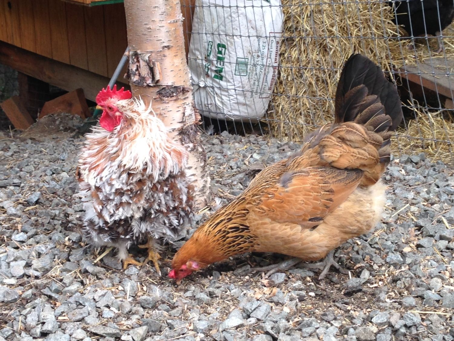 Frizzle Cochin (on left), Easter Egger (on right)