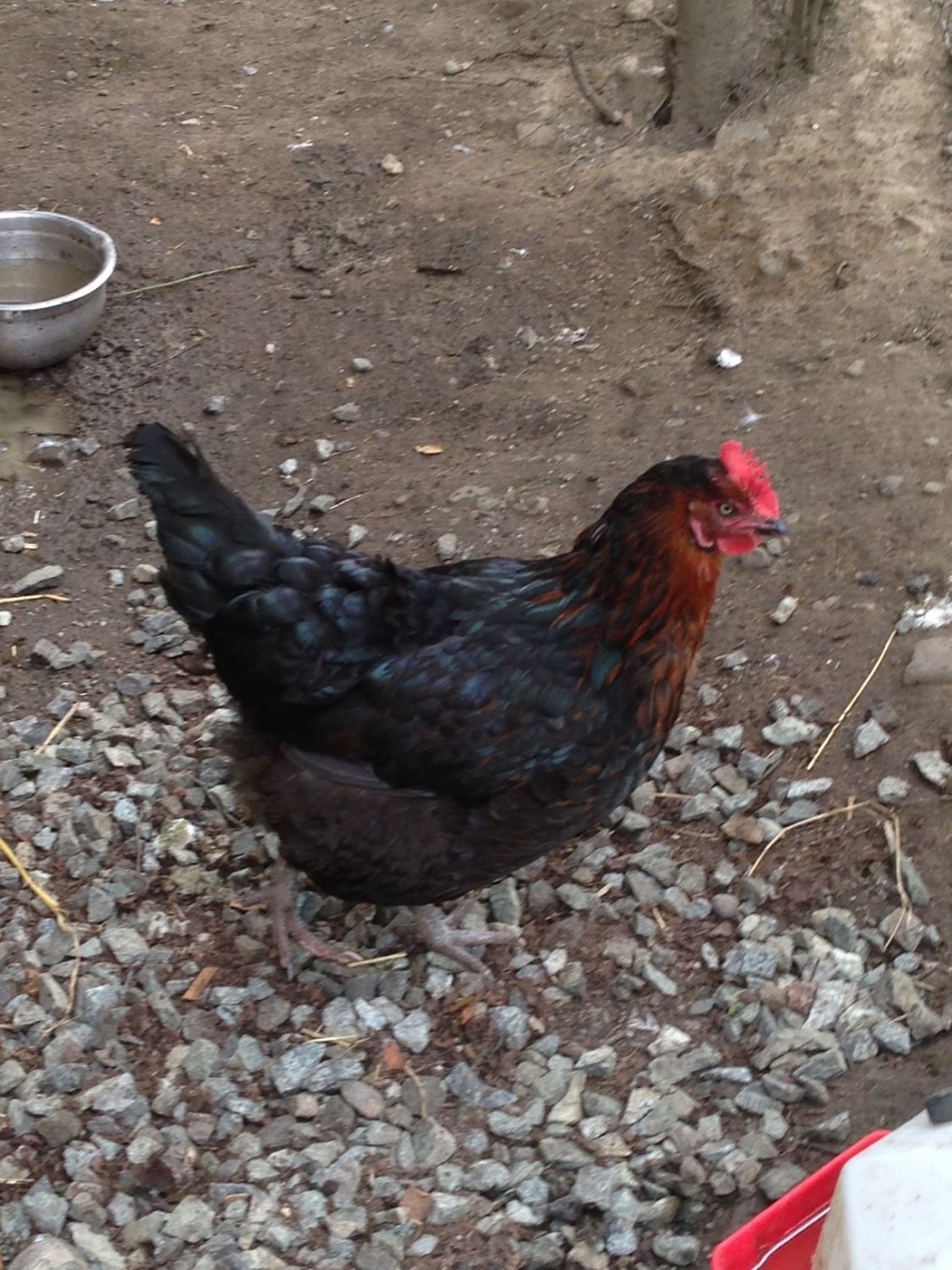 Bird in back: Easter Egger. Bird in front: Black Sex-Link or possibly a Black Copper Marans.