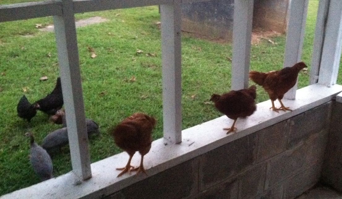 At any rate NO ONE wanted to go back into the coop tonight. I went through it many times checking peeking into every corner, to no avail. The guineas at least 2 are perched up in a tall tree the third may be up there now I hope. The Chickens are in one of my guest soon to be a bar room. We haven't done any remodeling in there and that's the room they were in before they went outside.