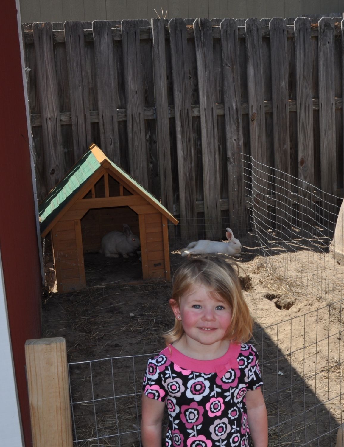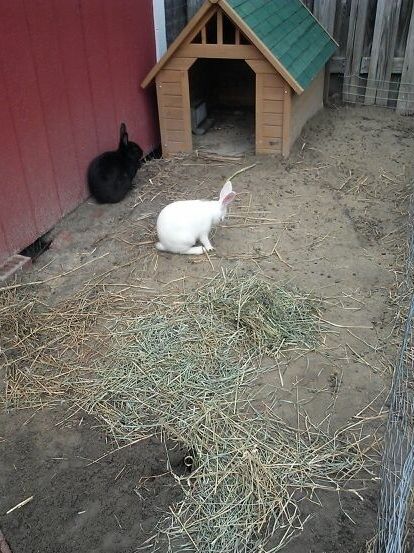 I am new to rabbits so it's pretty basic. There was 16 ft or so between the fence and our shed, so we fenced that in to be like a 16'x 14' pen. Then we buried livestock fencing about a foot down under the whole pen so they can't dig out. Then we split the pen in half to keep boys on one side and girls on the other. Each side has a dog house with plenty of room to sleep in. Then obviously they both have feeders, waterers, & hay. We also feed them fodder. We live in the city so there really aren't predators as you would have out in the country so this is about as secure as we need it. The rabbits are really happy to get to dig in the dirt and lay in the sun, not having the wire bottom cages. And it makes it a lot easier for me to clean, just rake out the poo & put it in the garden. Even our pet rabbits we let free range liked the set up so they joined the new ones haha. I have 4 boys and 3 girls. I was worried about too many boys fighting in the pen, but they all get a long great. Even like to snuggle together during the day.