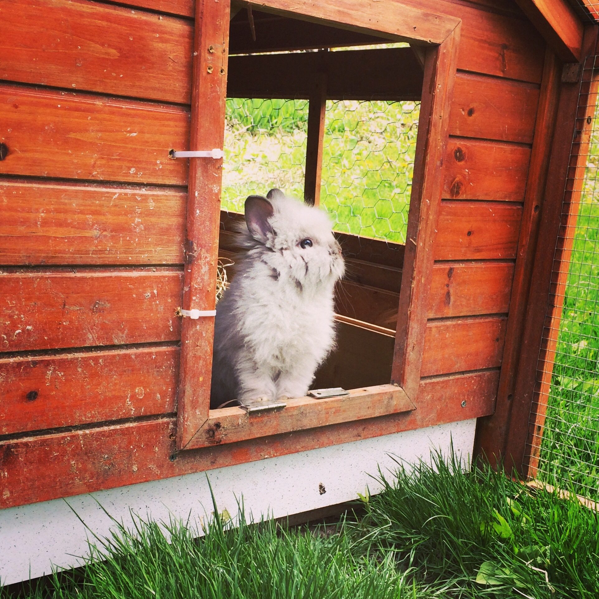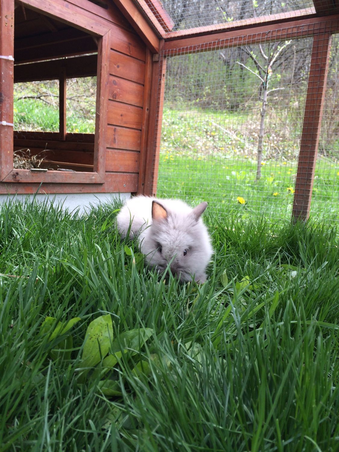 My little lionhead went outside last night since it's finally warming up here. His "cage" got moved to the top of the yard today and he is loving life!