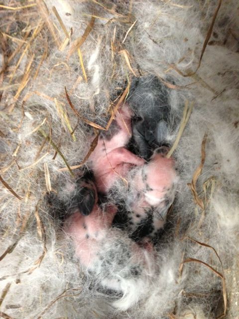 SO EXCITED ALREADY!Haha that's sweet and funny,atleast you have some nice kits nowMy mini Rex who is by herself gave birth yesterday to 5 babies 3 broken blacks, 1 black, and one white. Now I am questioning how did she get pregnant and then my son admits that he was outside and thought she looked lonely so he put the male Mini Rex in for a bit. She is 15 months old and this is her first litter but I would have liked to have known ahead of time that she was pregnant. Here is the picture I got today of them did get too good of a picture as momma was getting all Nervous