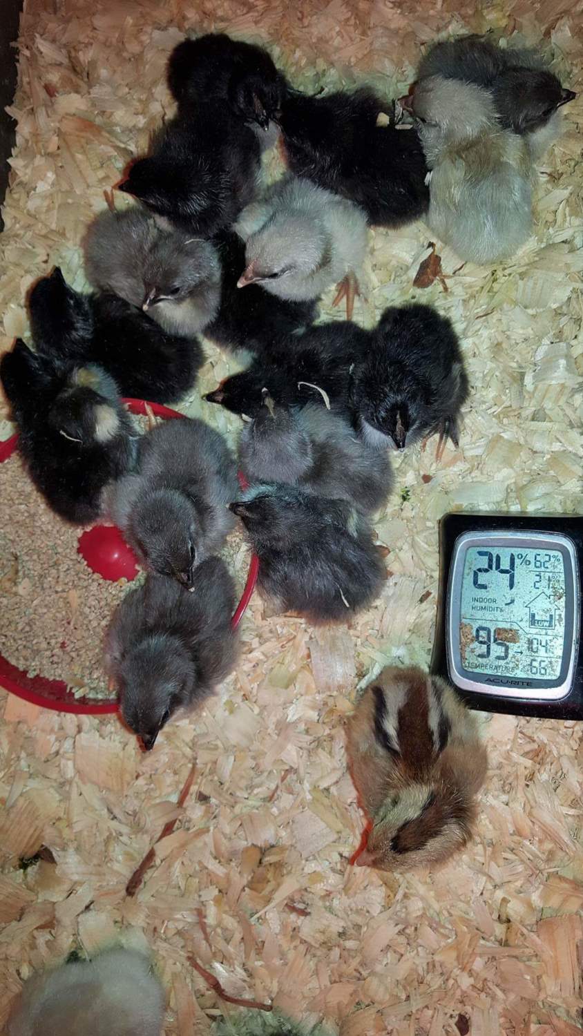I raise French copper Marans. I've had them for almost 5 years now. They stay in a coop. 1 black copper Marans rooster 1 Blue Copper Marans rooster. 7 Blue Copper Marans hens. I hatch many many many chicks every year. I always get a good amount of black a good amount of blue and some splash. Last night this guy hatched. He appears to be an Ameraucana. I had Ameraucana at one time but my last one sold back in the beginning of March of this year. I have never ever missed my birds. I keep them separated so that I always have purebred Birds. I cannot explain this little guy. In the Hatcher there were all dark brown eggs. But somehow this guy hatched out of one of them. This is the first time in five years this has happened. It does have leg featherings like my Marans. It just appears to be a little chipmunk striped chick???