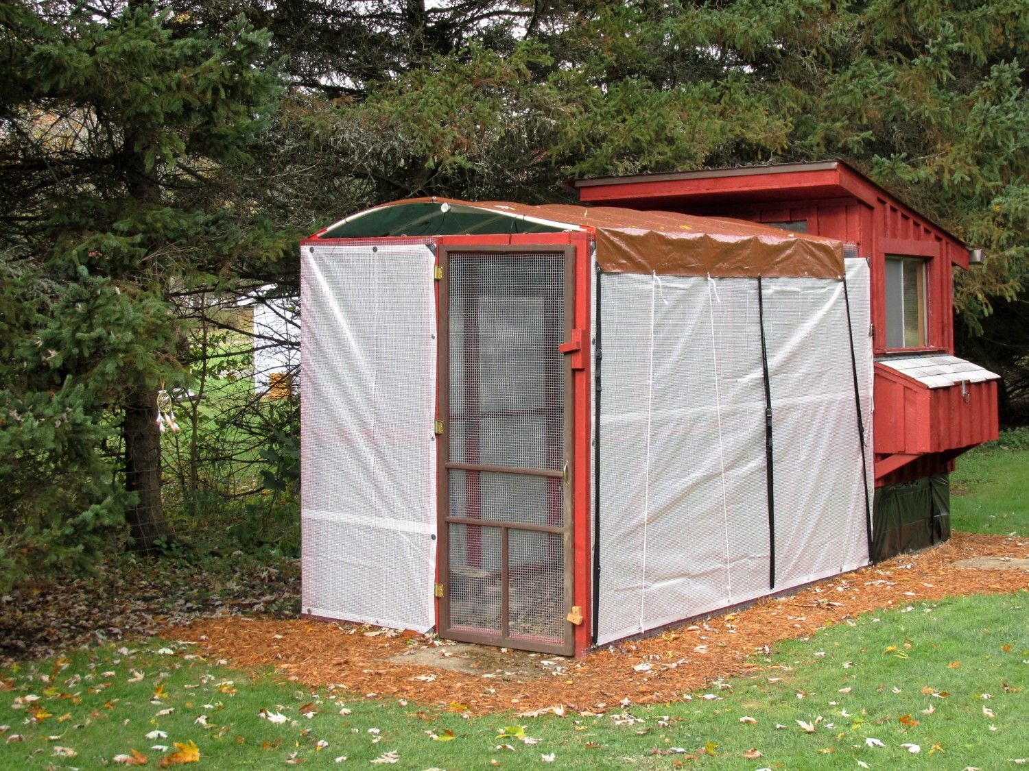 I added pine needles, pine shavings, and leaves to my run. I also put clear tarps on the sides of the run and a tarp over the top to keep out the weather for the winter. I plan on installing a permanent metal roof over the run this spring, with gutters to divert the rain away.