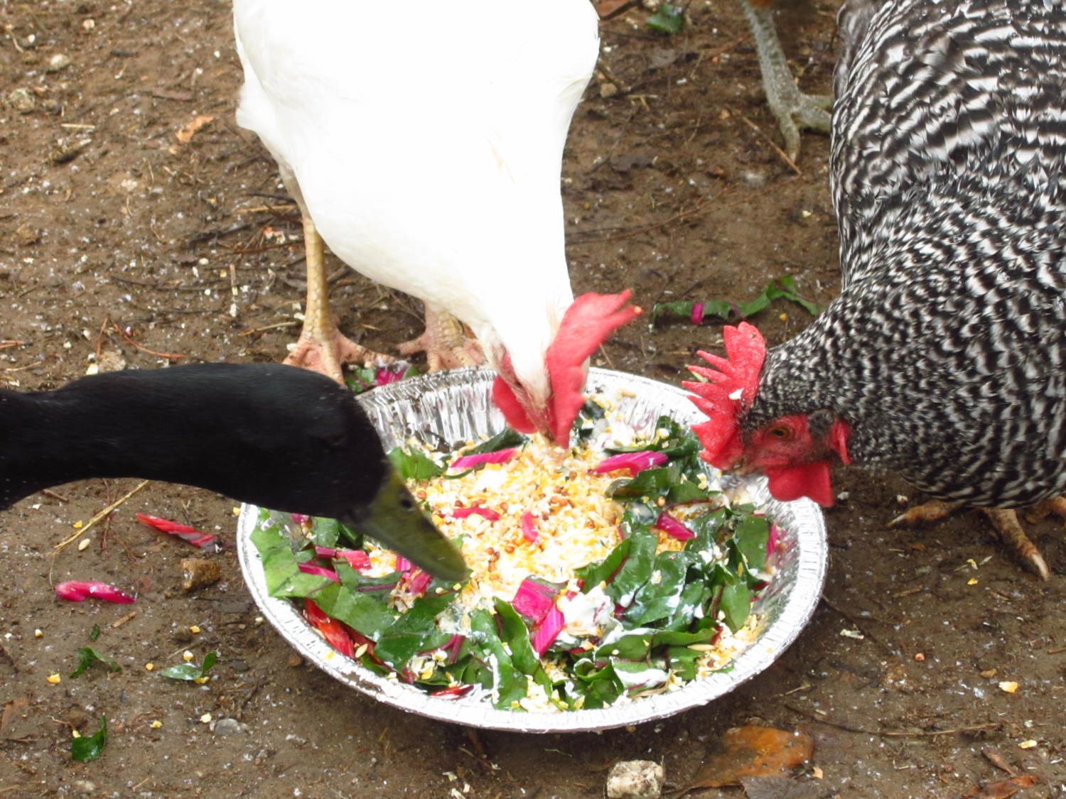 Layer of yogurt, then chard and cracked grains and mealworms, then repeat, then bananas around the edges!