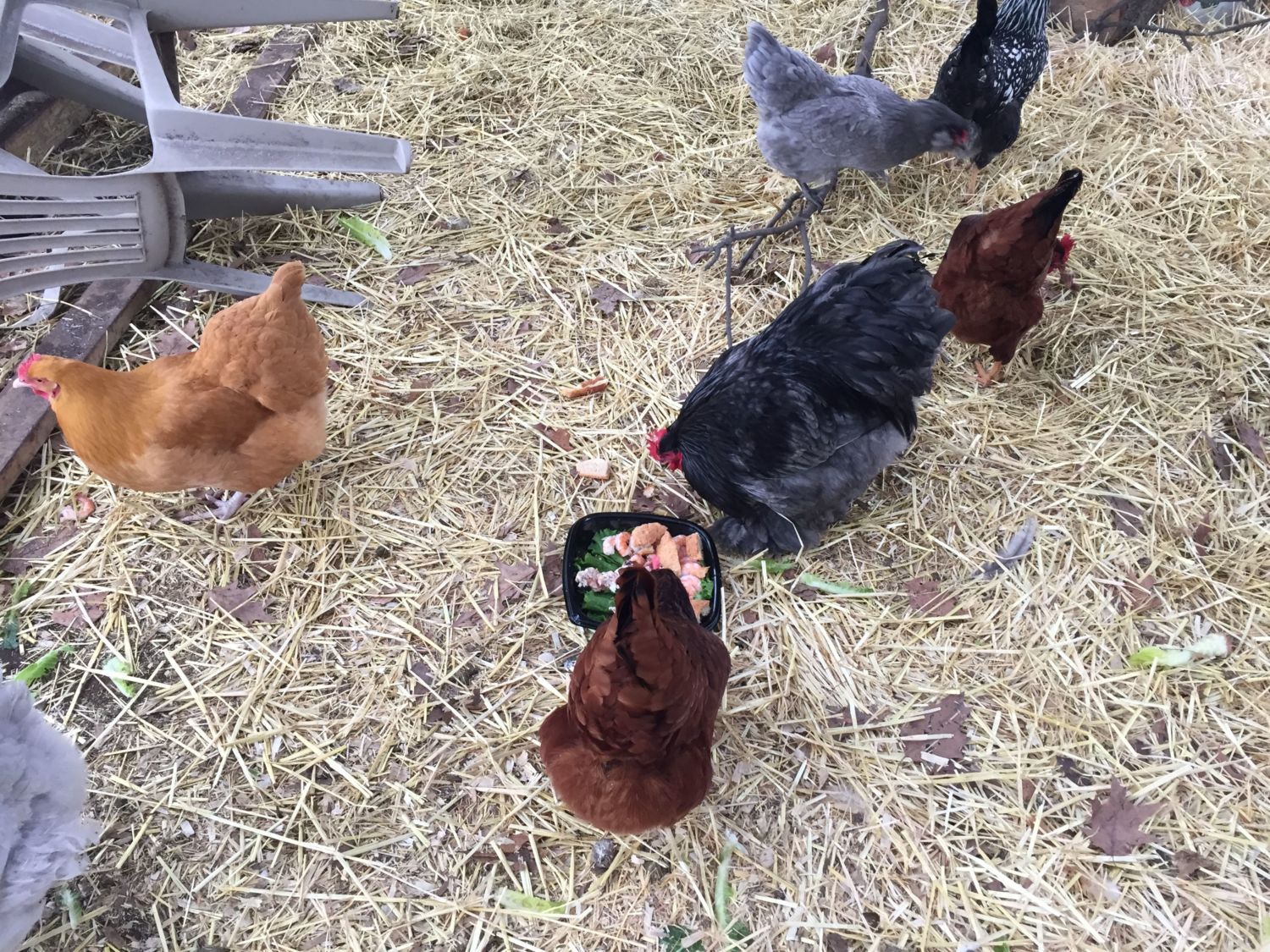 Shrimp, prime rib, lettuce, red rice, cracked corn. They LOVED the shrimp each hen took one and ran. It's the first time they've had any animal based protein and they went nuts.