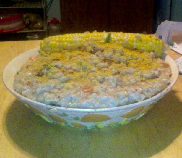 Barley, frozen watermelon, cucumbers and strawberries. Plus some apples that have been falling off the tree...we put them in whole and they chase them around pecking while they roll.