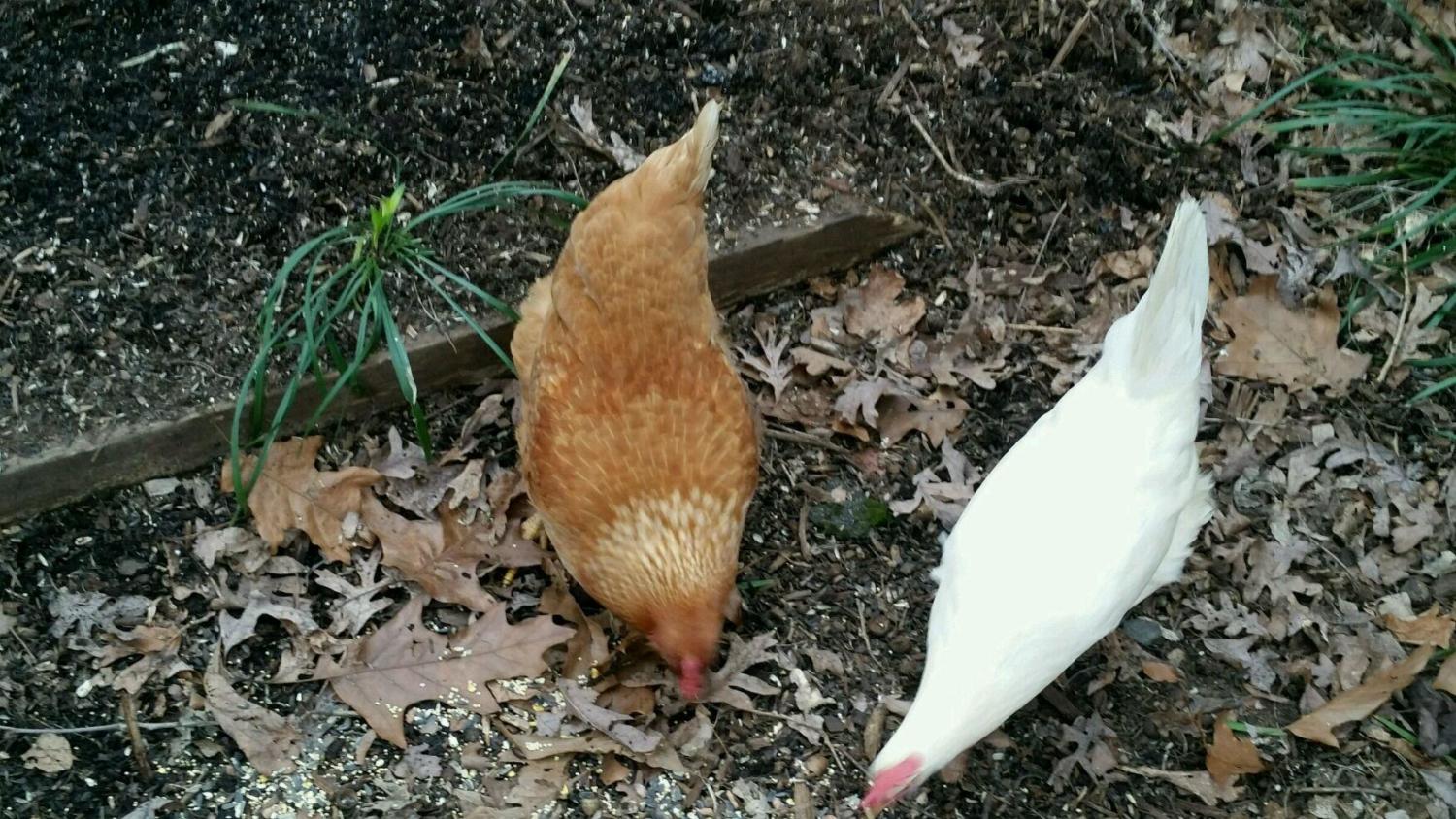 Going off a picture that just shows the top of the birds (cant see stance, leg color, or any of the important stuff) I would say the bird on the left is a Red Sex-Link and the bird on the right is a leghorn type fowl. (could be any number of white production egg laying hens that carry a heavy amount of Mediterranean breeds in it.)