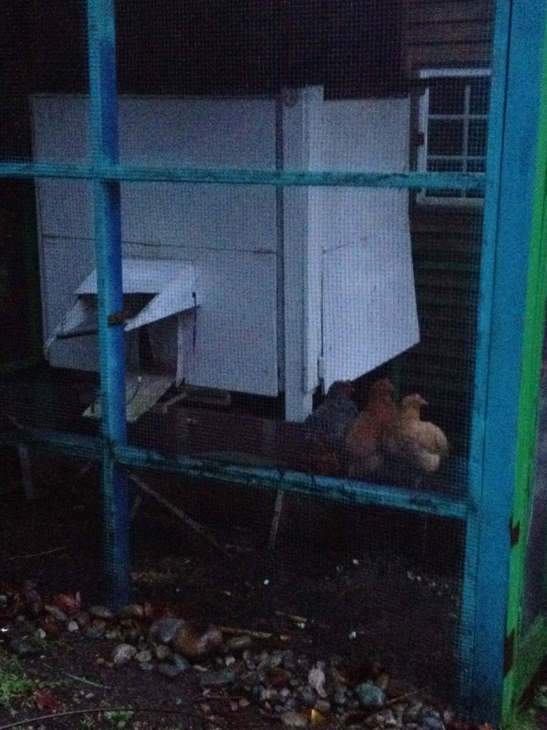 Front pic. Chickens are perched on a board separating the two sides. I think they prefer to roost there rather than go inside. I know at least one of them has gone in the coop though, since there have been eggs in it.
