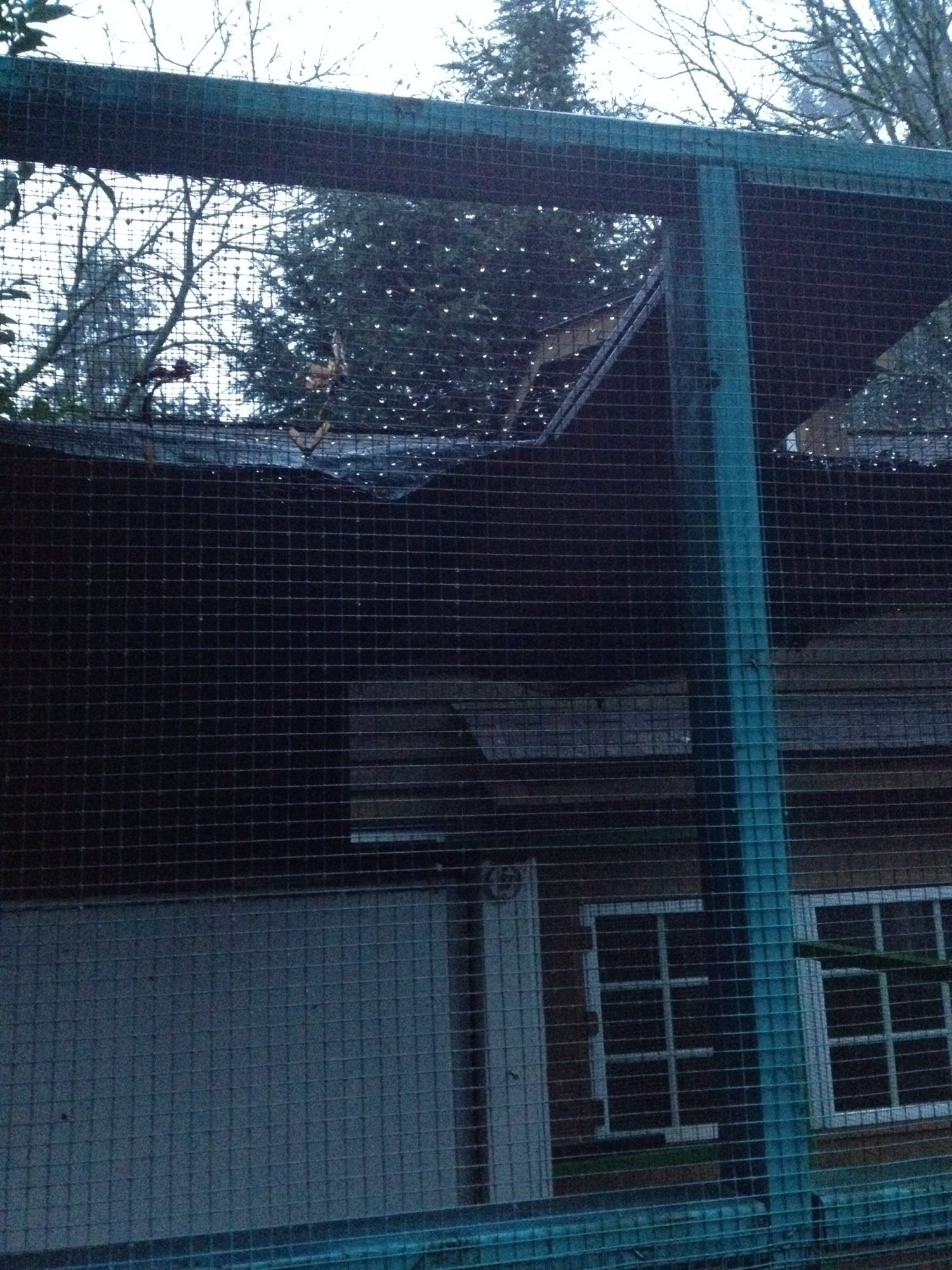 I just moved into a rental house with a short-term lease. I wasn't able to get my coop into the backyard, but this house has a coop already, so my three birds are in it. The problem: it's a wet place. Winter is very wet in Seattle. The actual coop portion is semi-dry, but the run has no proper roof. The existing bedding of the run (half straw, half leaves) is just gross. Some previous tenant put a tarp across the top (which is otherwise covered in hardware cloth), but it has since been punctured, not to mention weighed down with leaves. It's not a sturdy setup.