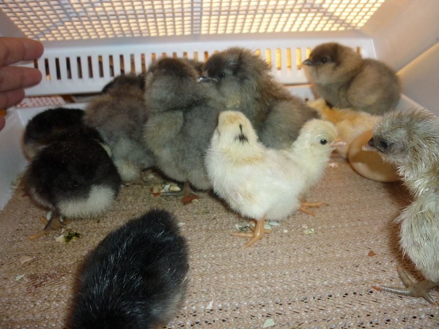 the white eggs- black mottled jap bantams (hatch yellow with black dot on head) (one egg will not hatch)