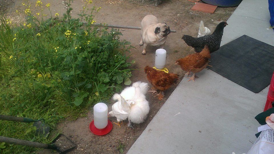 and heres a picture of some of the chicks I have now, the barred one and the brown one on the sidewalk are from Michelle's last batch of EE eggs. Oh and that's my Livestock Guardian Pug there, she does ok as long as the chicks don't tick her off.