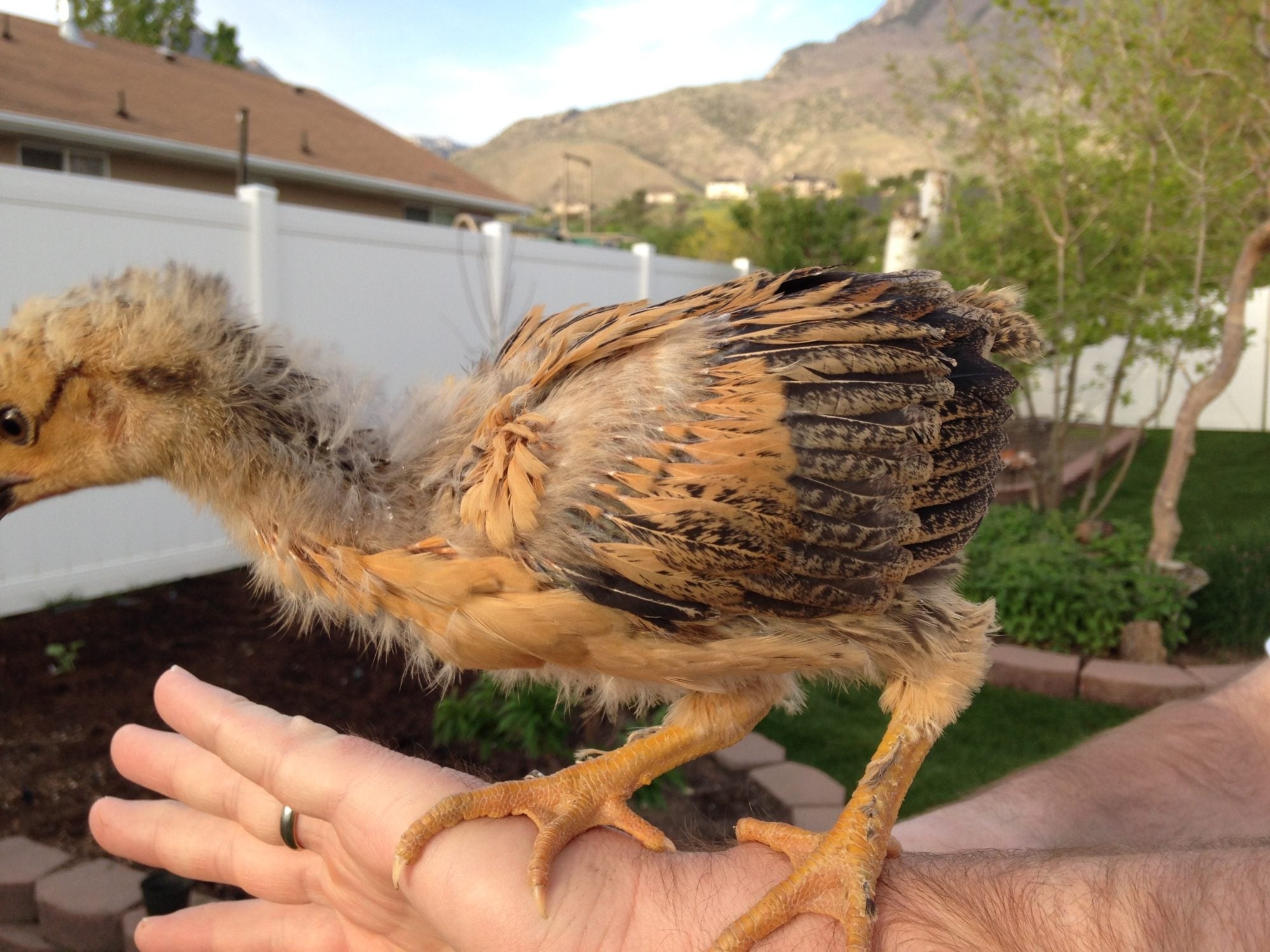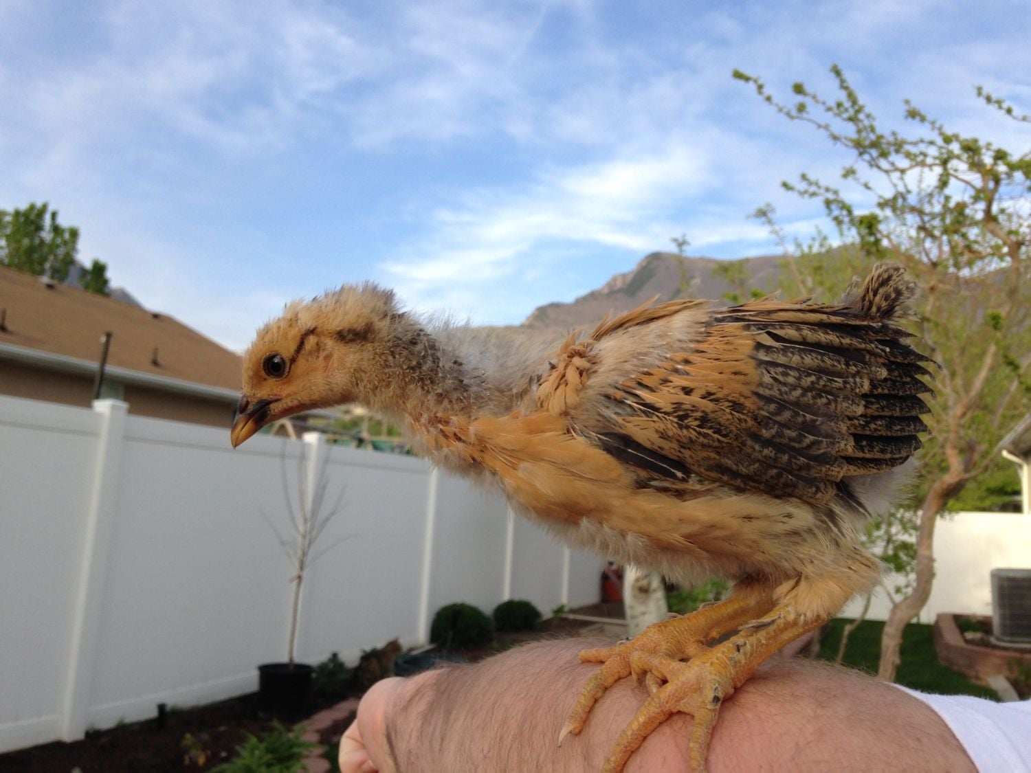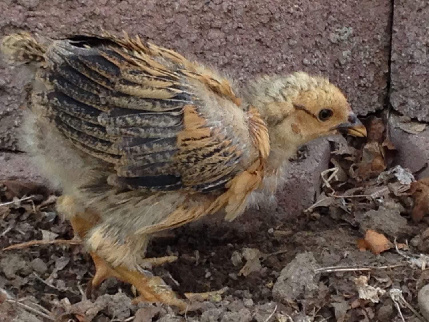 This is Cheerio. She was hatched April 5th. When we purchased her we were told she was a Legbar (and we paid the price for a Legbar) but I'm not so sure. I'm not even sure she is a she. She has long, thick legs with feathers starting to grow down her legs. Last I checked Legbars don't have feathers on their legs. She has a long neck and a sleek body. What do you think she is?