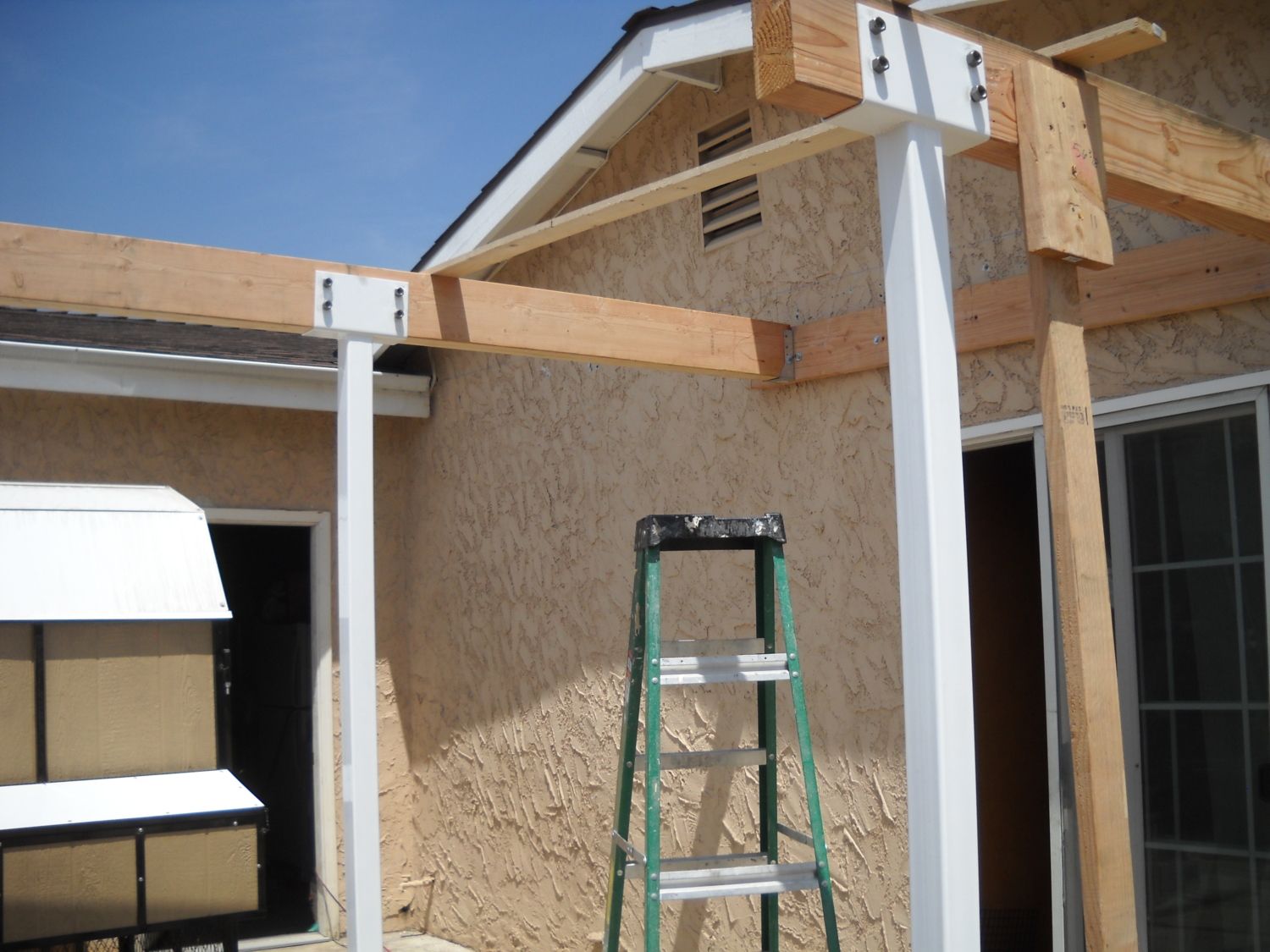 The coop is left next to garage door and kitchen sliding door is on the far right of photo - we're building a patio roof for coop shade in summer and for us to stay dry when collecting eggs in rainy weather: