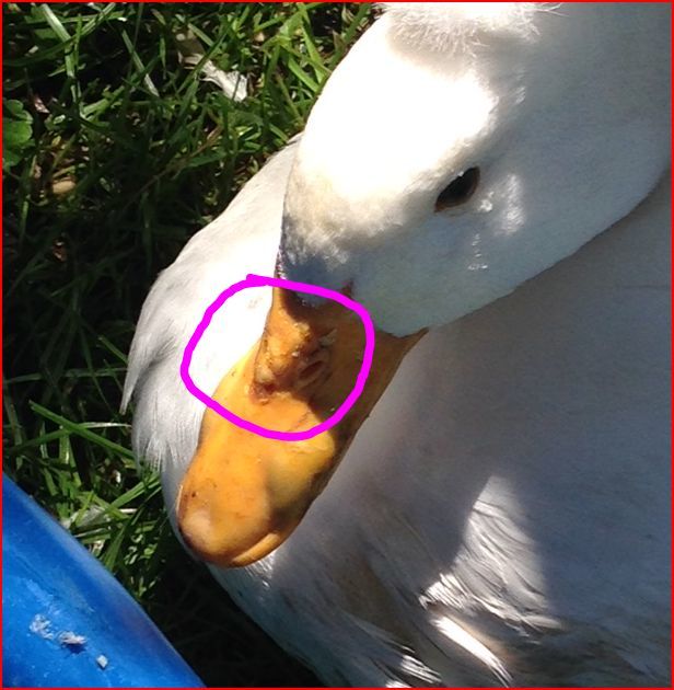 Can you post another picture of her bill?yes, its dirt and dry food on her bill, she cant clean herself in the water like my other duck, so her bill and underside is dirty, i tried to clean her of but i think i was stressing her, but this morning she can sort of stand but after a little but she has to balance on her wing,so her legs seem to be getting better, i am going to the feed store this morning.