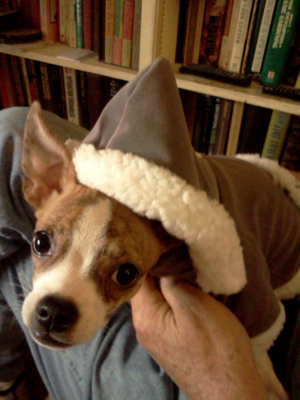 DAPHNE: Our "baby" born in May. She's a Chihuahua and Boston Terrier mix and is smart as a whip! She's the "biggest little dog" I've ever known. This is Daphne modeling her new winter coat, which she has since outgrown.