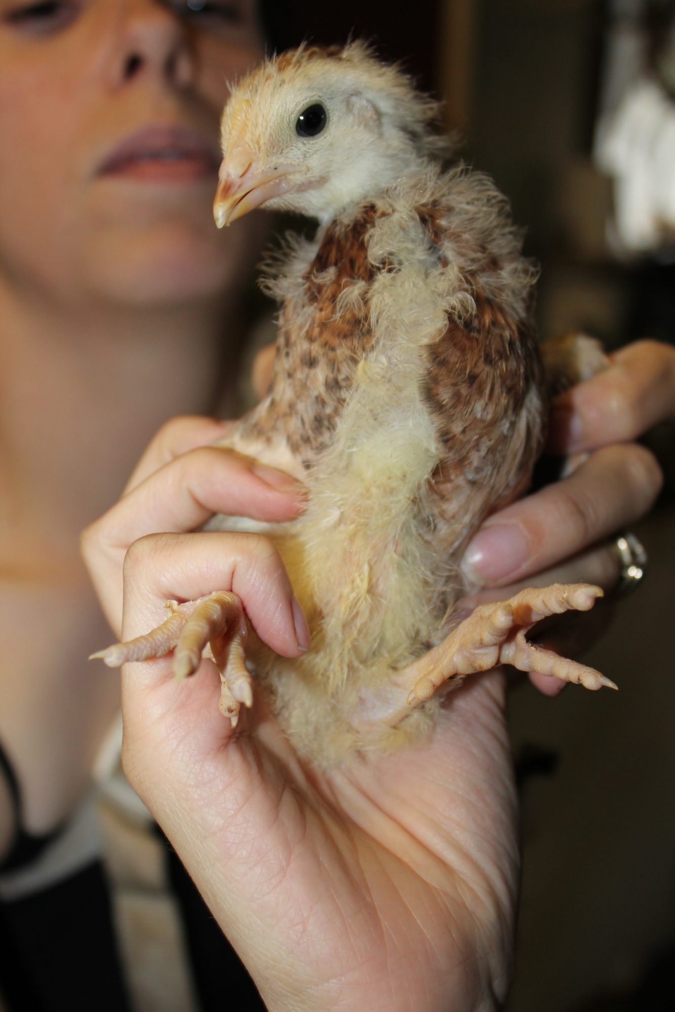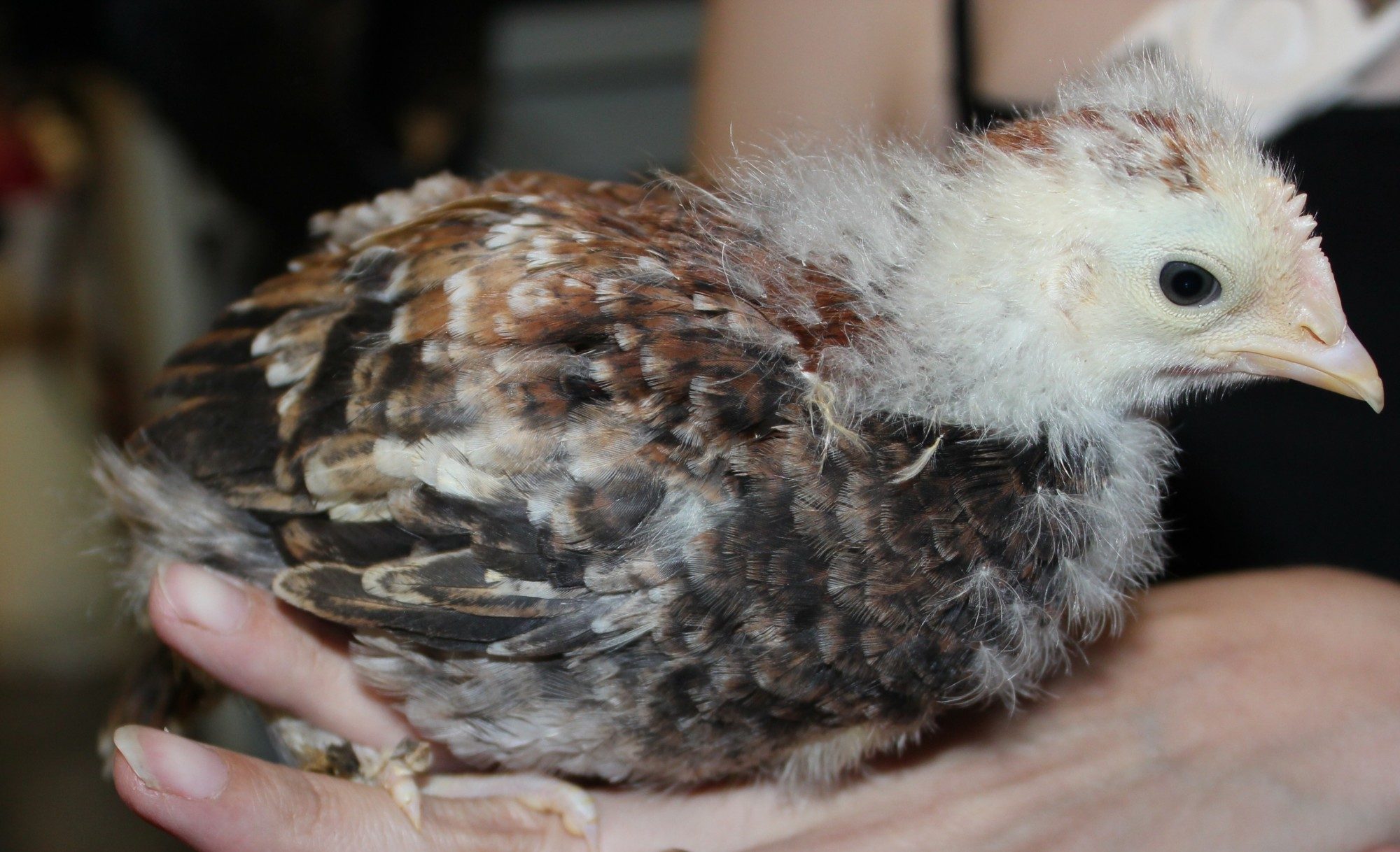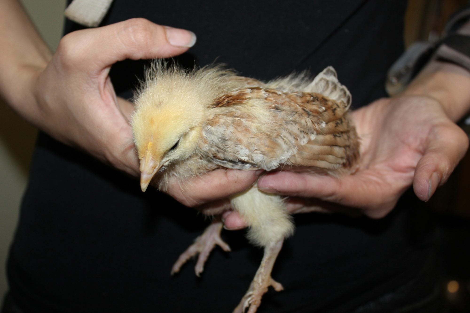 This one hatched at the same time as the other three, but there is quite a bit less black and the chest has no black at all, unlike the first three that have back all over their chests.