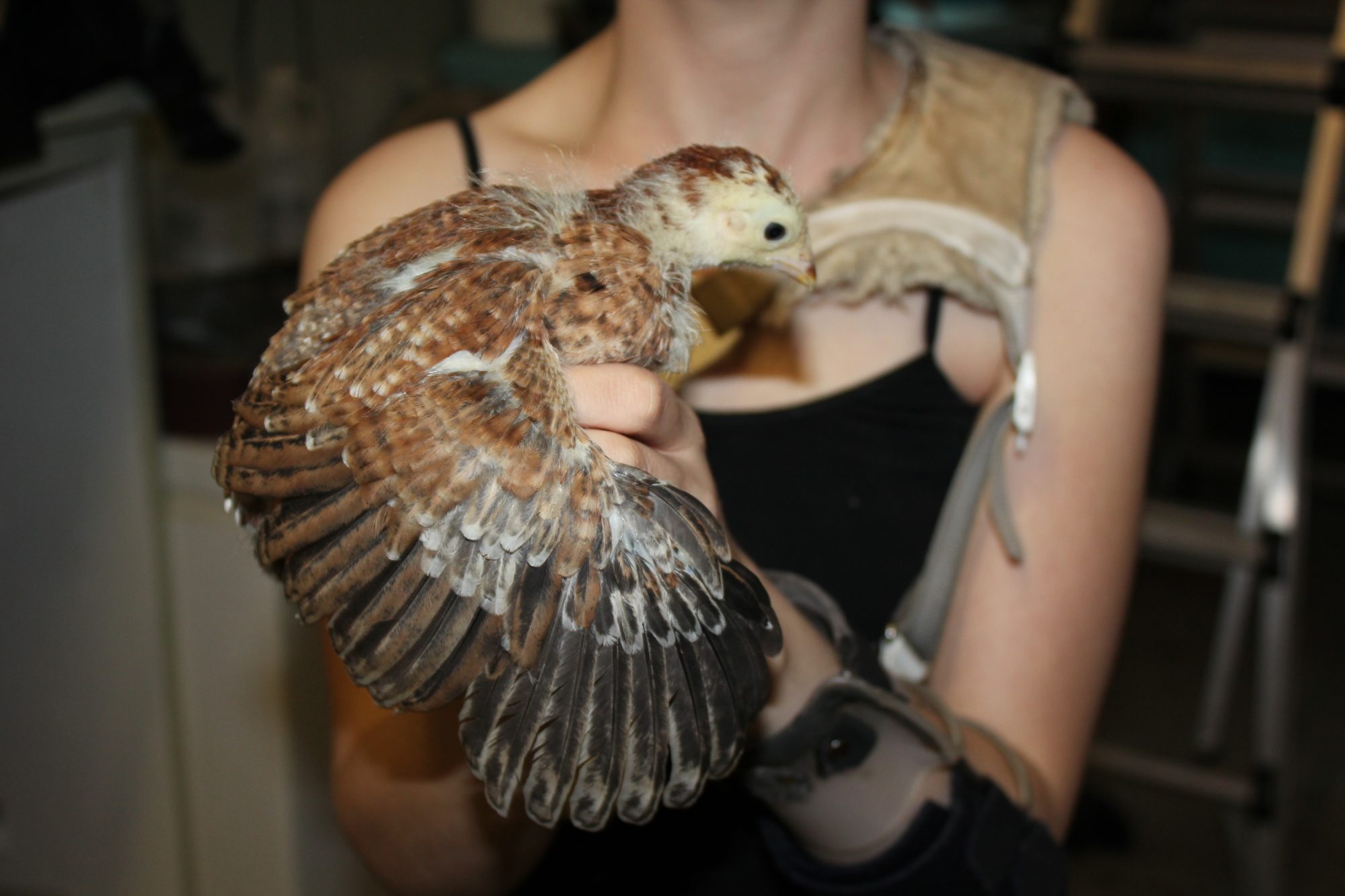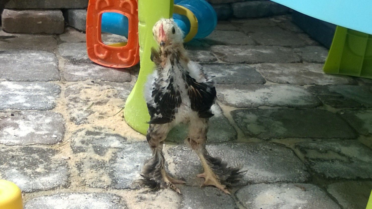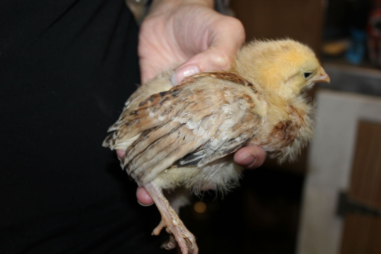 This one hatched at the same time as the other three, but there is quite a bit less black and the chest has no black at all, unlike the first three that have back all over their chests.