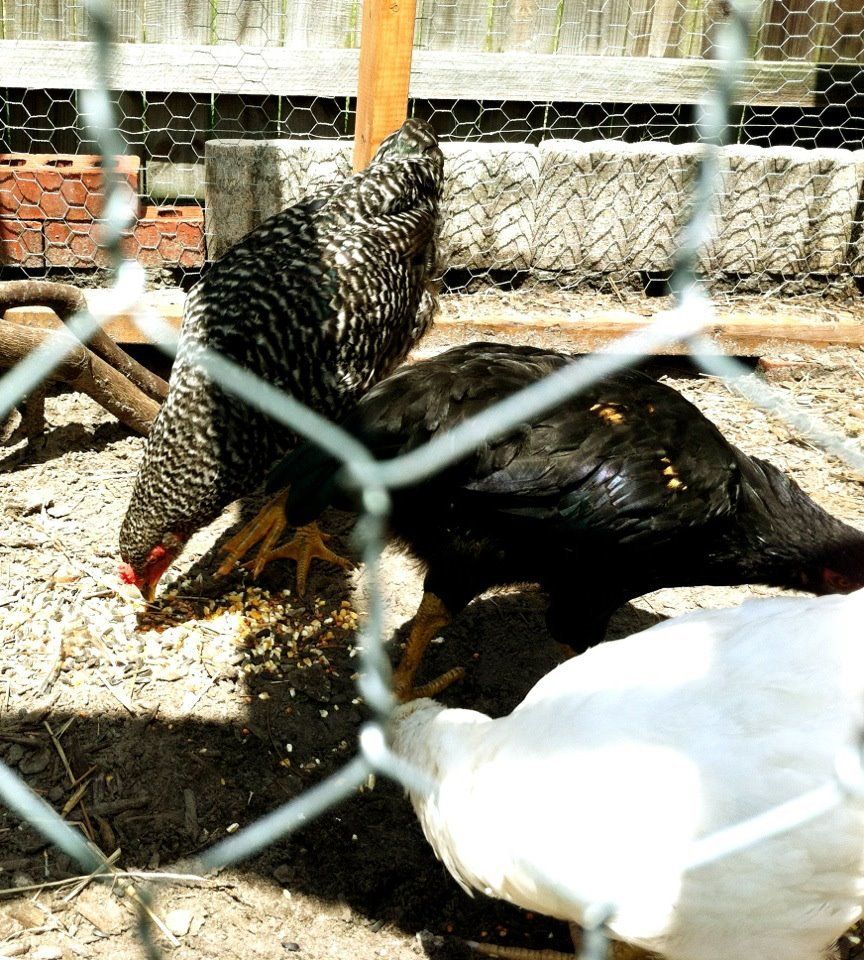 The neighbors (where this bird came from at about 8 - 10 weeks old, I believe), are of the opinion that "Smokey" (below, in the middle with the gold leakage) is a rooster. The only one to crow has been the white one, and only once. The barred chicken and the black one that is in question both started "honking" a couple of weeks ago. Any thoughts on this? The older two birds are probably about 16 - 18 weeks and the younger two (the black one and the white one) are probably around 12 - 14 weeks. The three pictured below do a lot of fluffed up posturing with each other, but like I said, I haven't heard any crowing except for the one time.