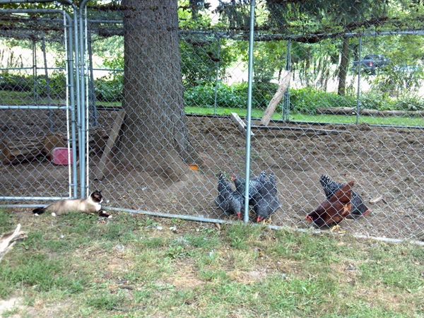 Well, yesterday we starting getting 2 eggs a day {from 6 hens}, and today it all of a sudden went to 3 eggs. So it's pucking up quickly now. They have been laying eggs for about 2 weeks. Here's a pic of the company that loves to visit them often. Lol.. He's NOT allowed in with them.