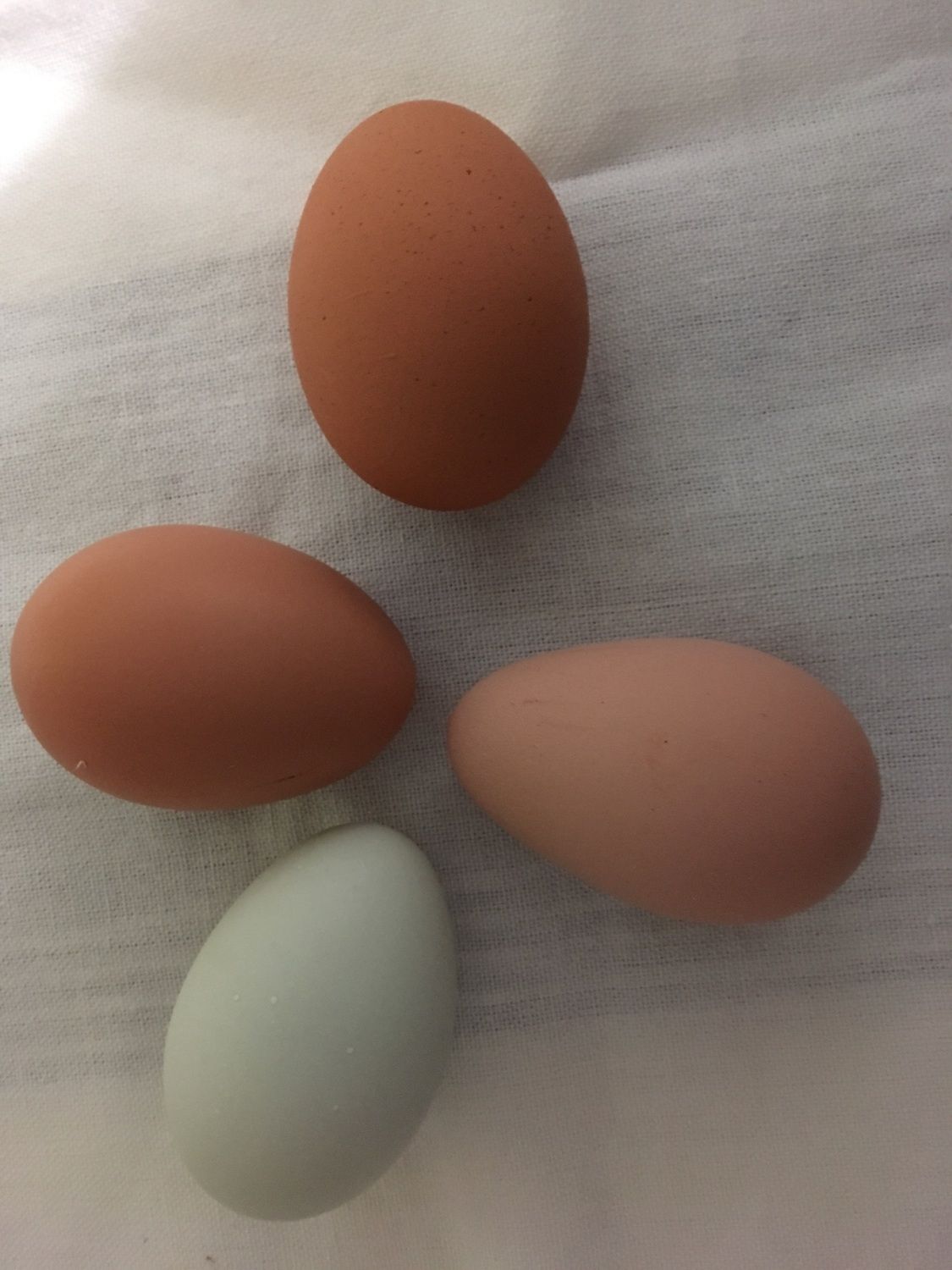 Halleluyer!! Eggs. The girls finally came through. My EE Ethel Mertz laid the most perfect green egg. Four of the girls decided to lay their first egg yesterday. Beautiful.