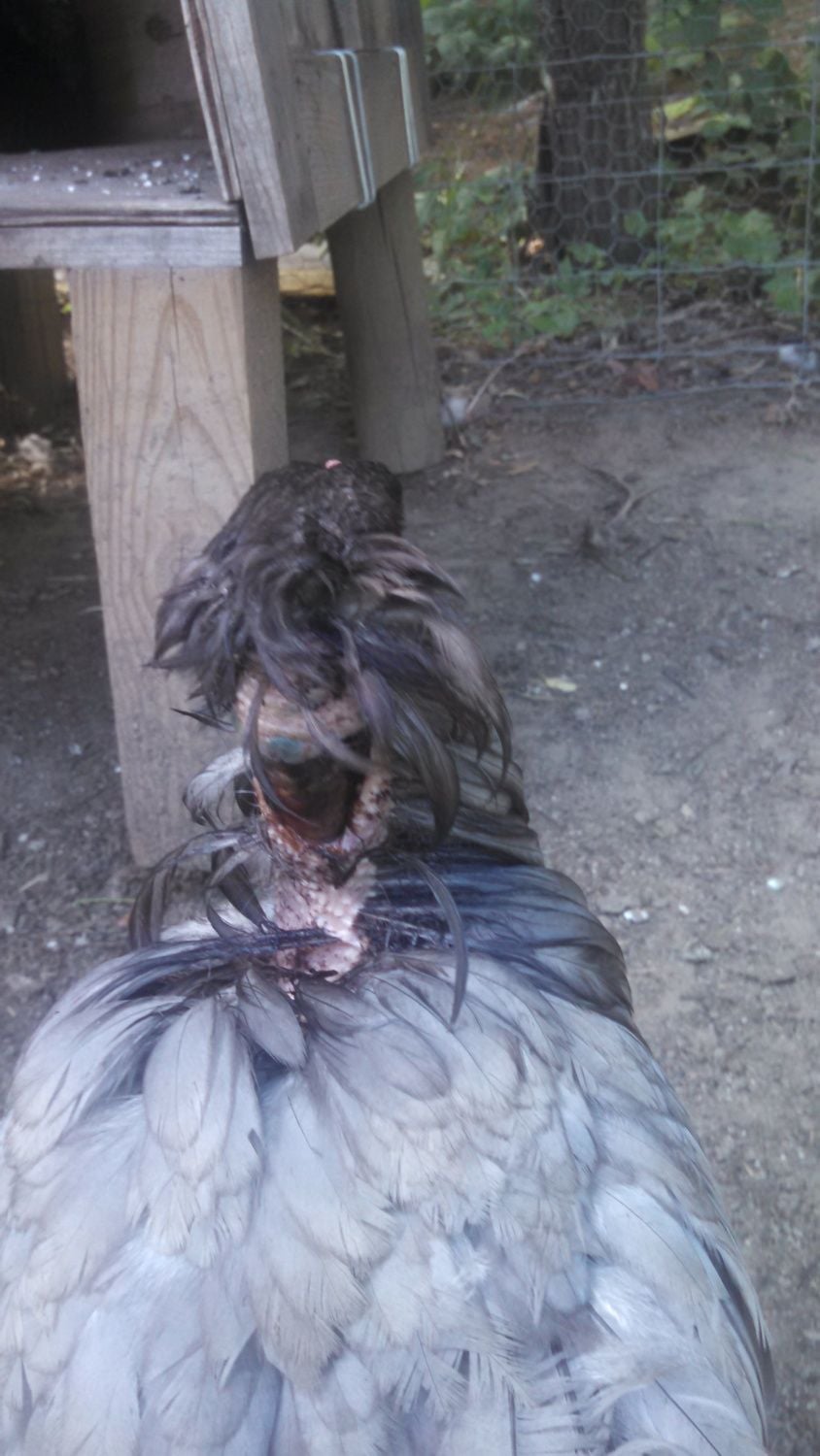 Her spirits seem greatly improved but I can't imagine how a wound this size will ever heal! The pictures don't show the deep pocket that wraps under to her windpipe because I can't hold the flap of skin up and hold her and the camera. Trust me, its deep. Any ideas what animal could have done this? My husband thinks hawk.