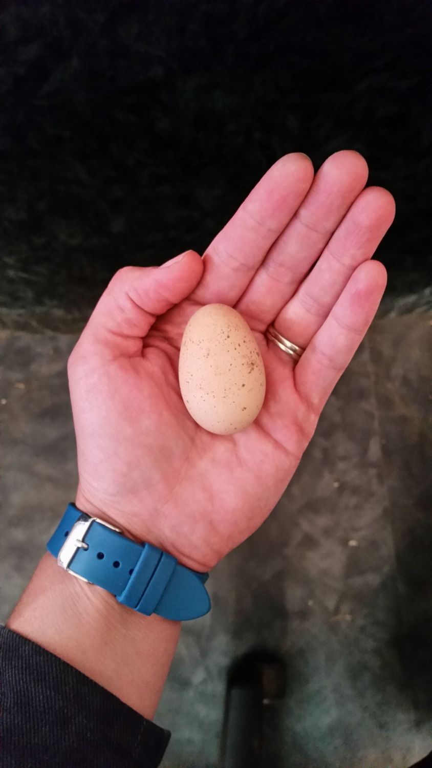 My maran, Countess Chocula, JUST laid her first egg. It is small (like my other breeds' first eggs) and spotted! She is about 25 weeks old. It all began six months ago, and I am very much enjoying being a chicken lady!