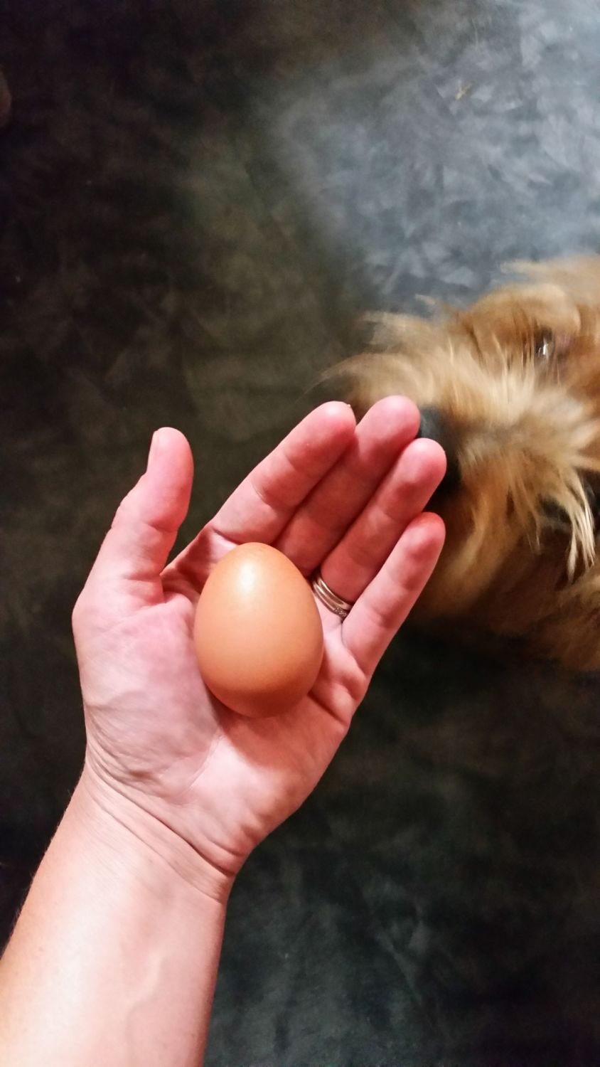 Here is her latest egg (and next to her first for comparison). That's Dexter in the shot. Camera hog.