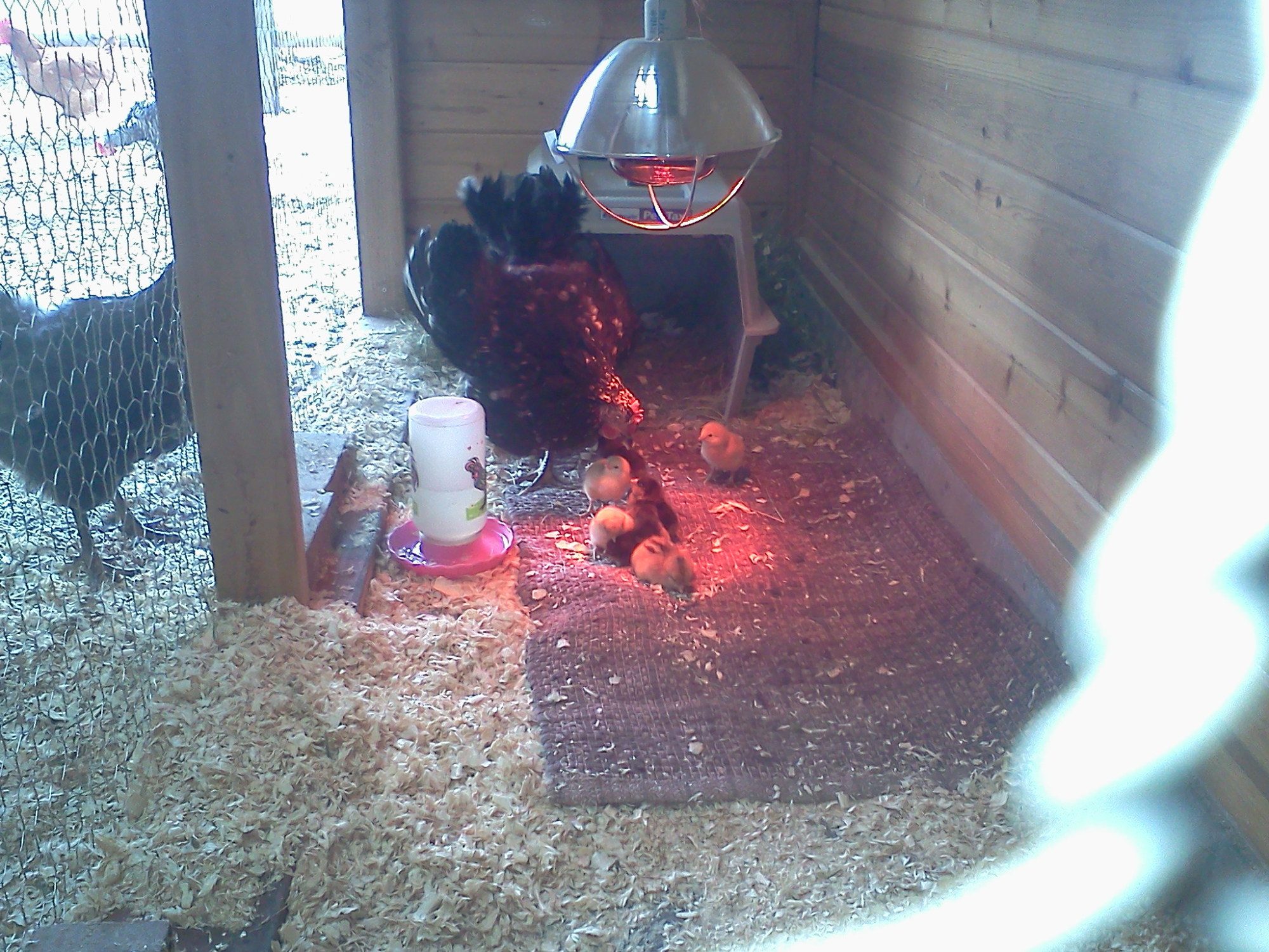 My 6 chicks are separated from the big girls with their mommy. They can all see each other thru a chicken wire divider. Whenever I feed treats to the girls, mommy runs up to see what they're getting. I don't feel good about putting a bowl of oatmeal (or whatever it happens to be) in there with the 2 week old babies being so incredibly curious. Momma deserves treats more than anybody, but I don't want the baby chickie monkeys getting sick.