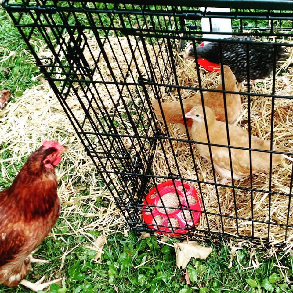 Currently, the chicks are still eating medicated chick feed. They are living in the same run as the adults but within the confined of an extra large dog crate. They have a cat carrier inside the dog crate for shelter. They have been living outside for 2 weeks in their previous home. I had planned to keep them in the dog crate (the wire kind with the bottom removed so they can eat grass that grows between the wire). How long should I keep them separate from my adult chickens? A week? A month?