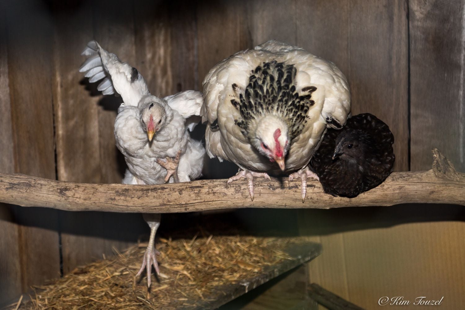 Hi, my chicks are 6 weeks old now. How old should they be to start sleeping on a roost? Is 6 weeks too young? They have been sleeping under mother hen or beside her in a small dog kennel they hatched in which is inside the chicken house. They have been sitting on poles out in the chicken yard so today I decided I would get rid of the box and put a good amount of sugarcane mulch in the corner where they have been sleeping instead. I have two roosts..one low to the ground and a second higher one. I put a ramp up to the top of nesting boxes which chickens can use to get up on the roost. I went up to the pen after dark and this photo is what I found. Chickens trying to hide under mother hen on the roost and using the higher not lower roost. Can they hurt themselves if they fall?