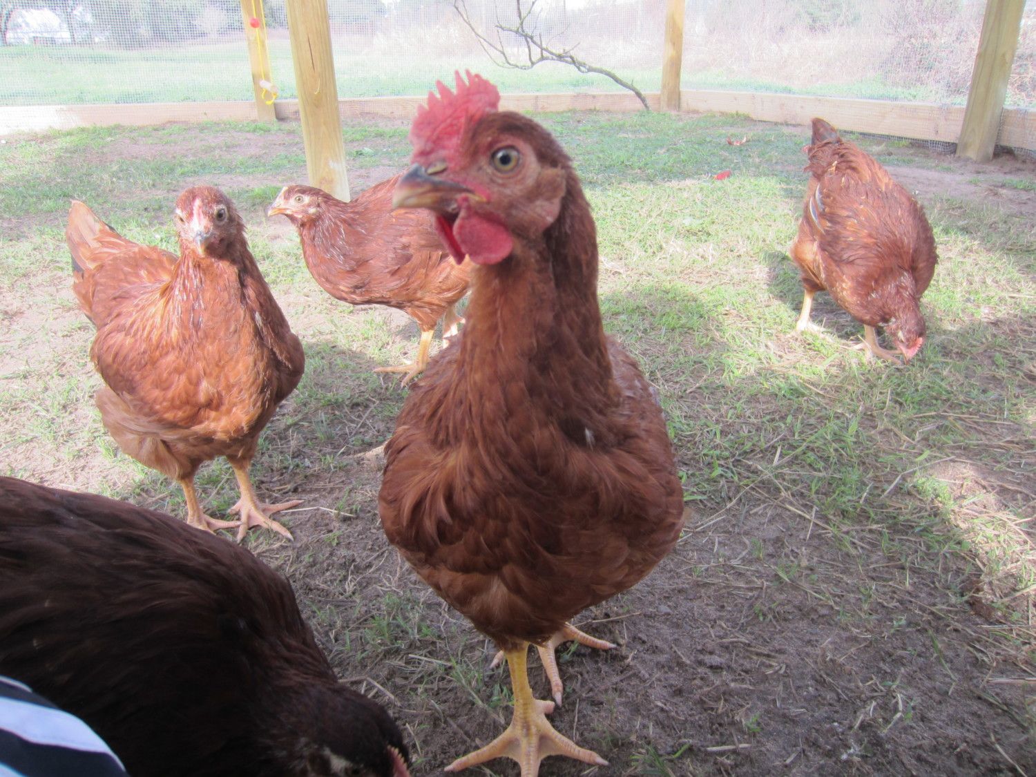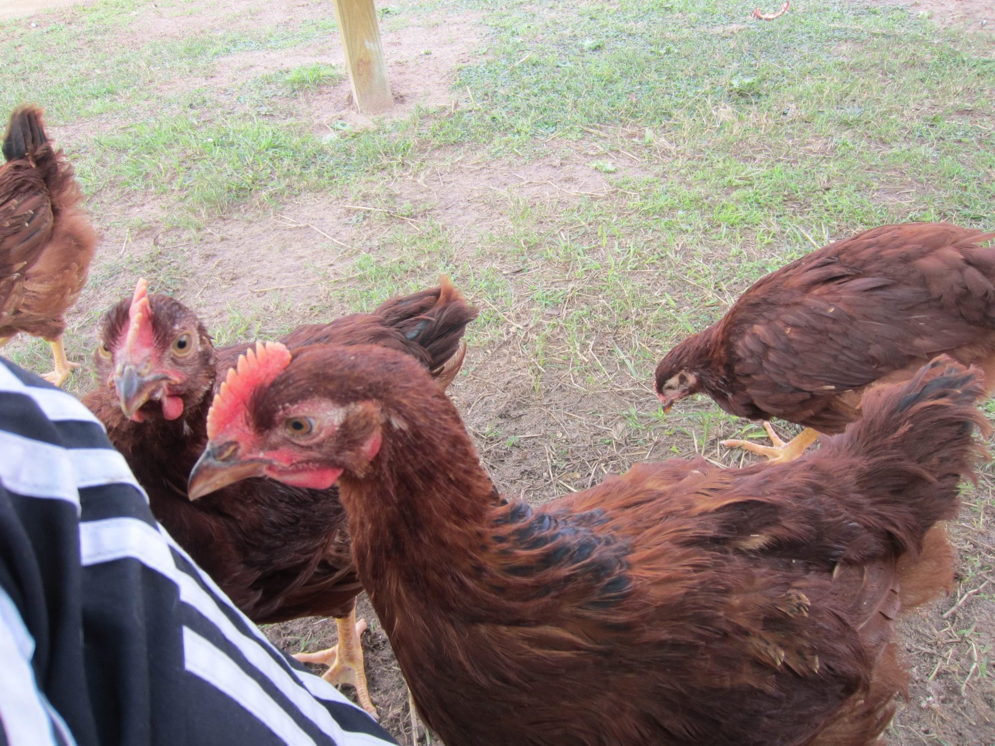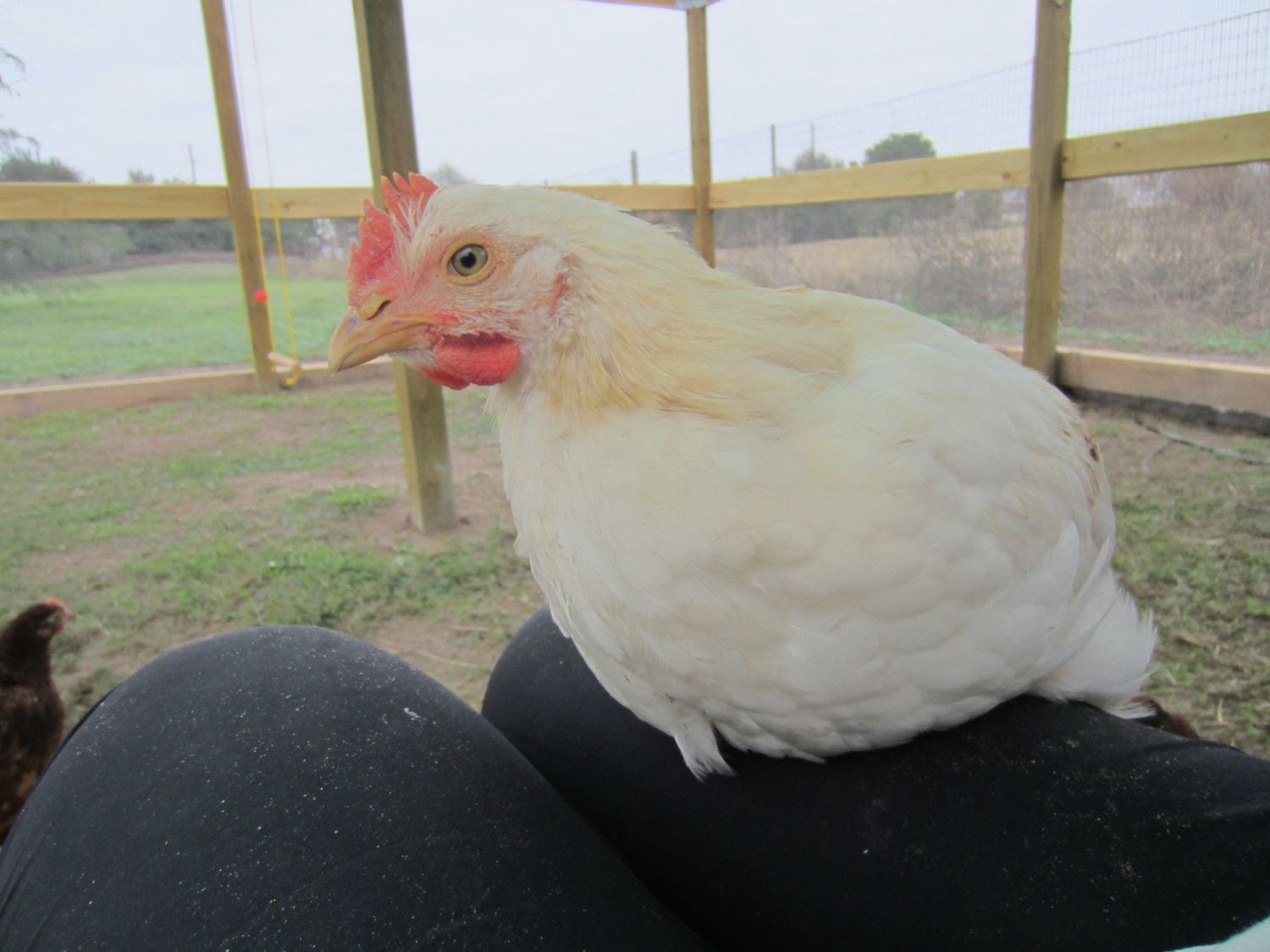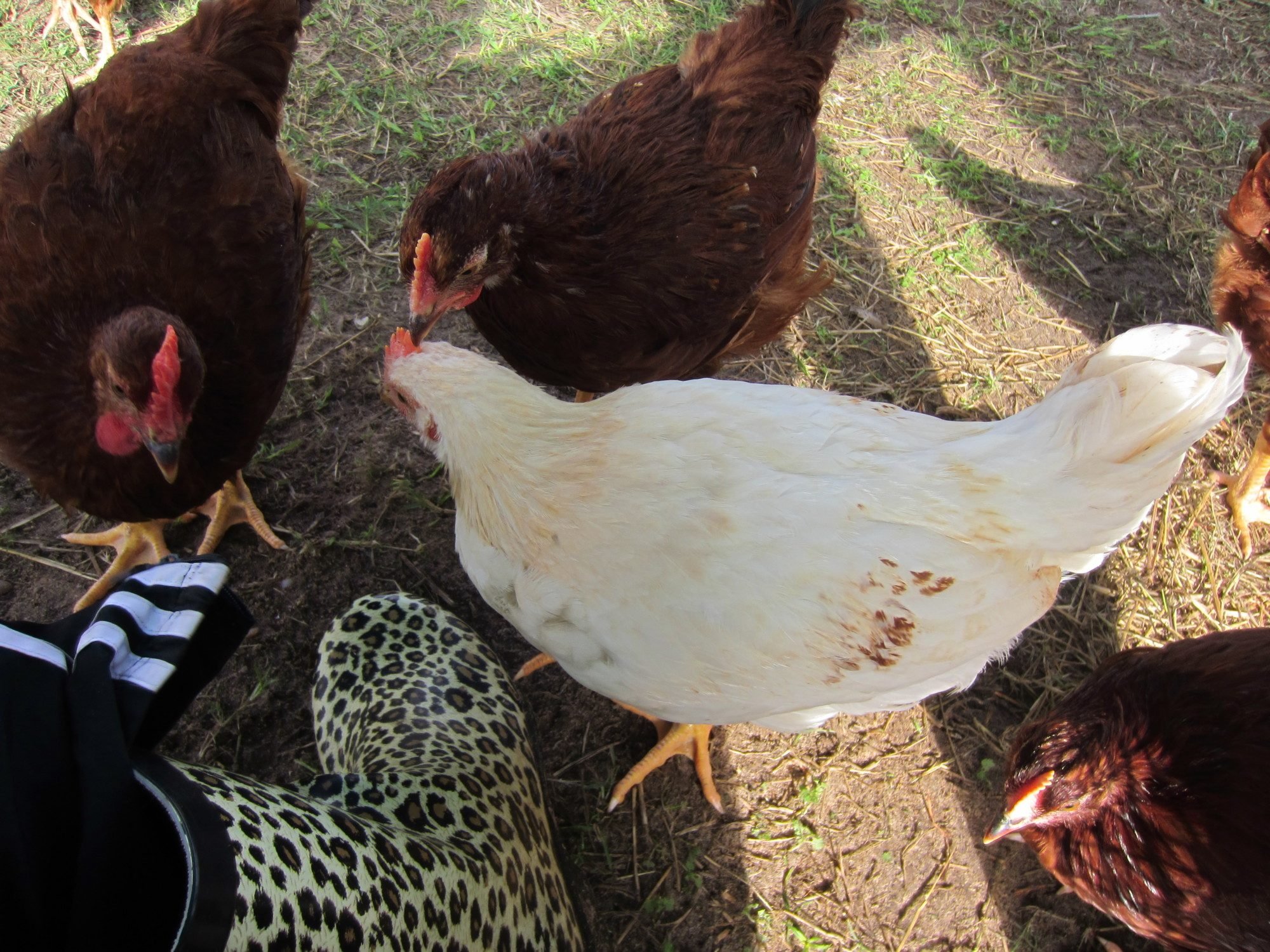 This one I thought was the only Leghorn, but he/she has some light coloring around the neck and brown flecks on the wings you can barely see on the far right. Hard to compare comb size because he/she is the only one of this color/breed. The farmer who donated the eggs to our school had lots of breeds of hens and roosters running around so this could be a mixture. He/she flew up onto my knee and settled in for a nap.