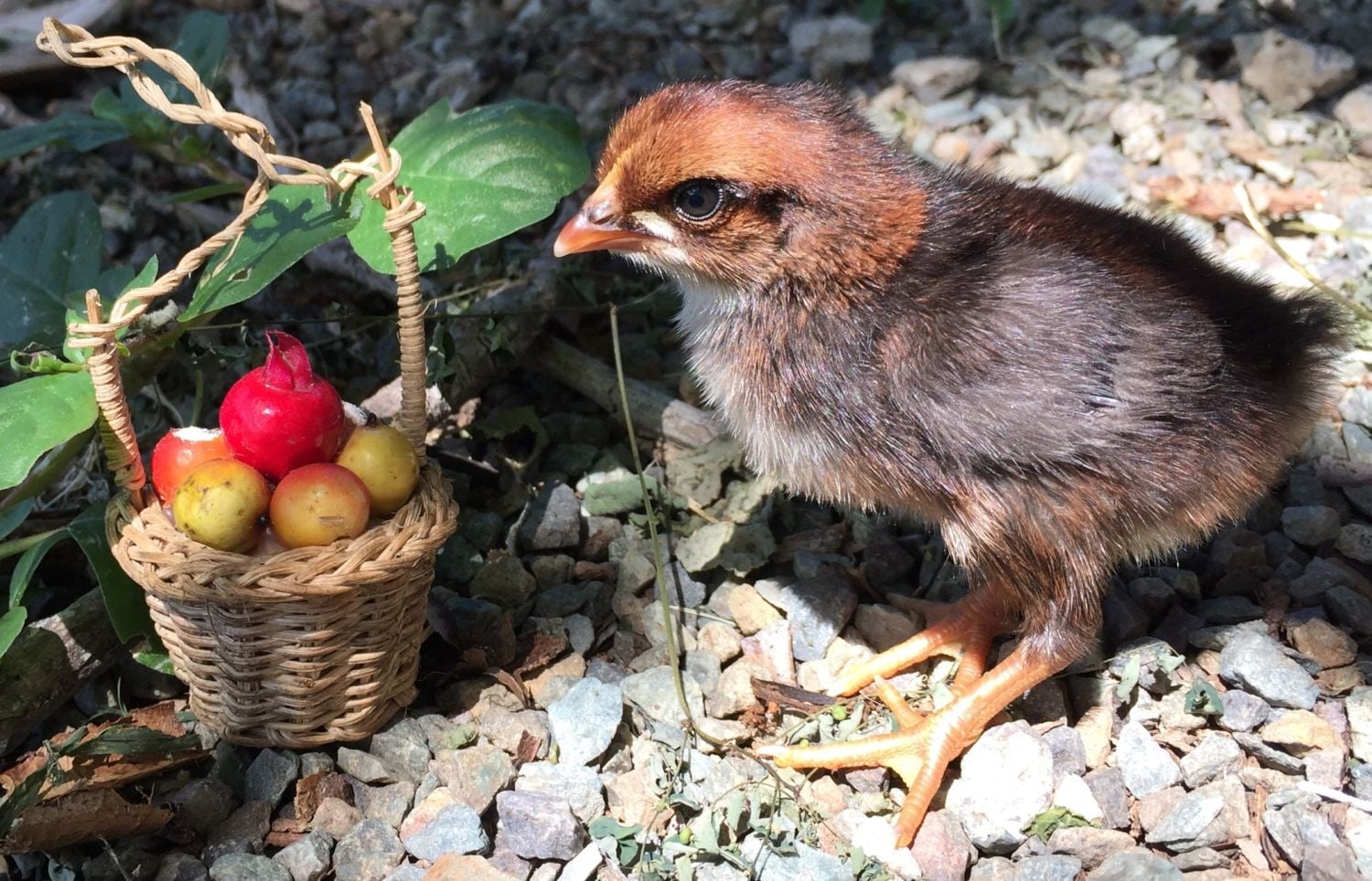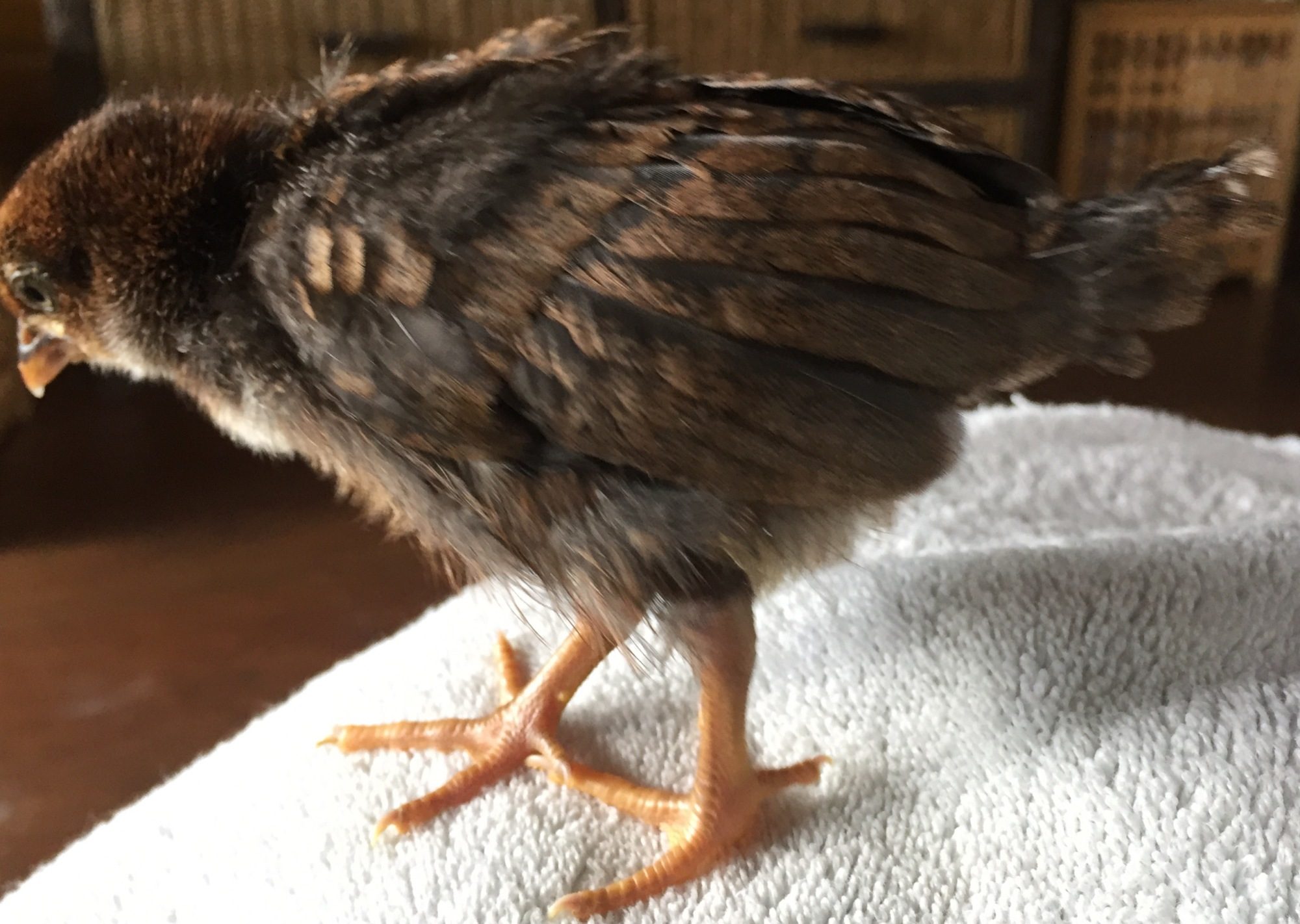 We found her abandoned and roosters were trying to peck her to death. So we brought her to our very small cottage with three hunting cats. We could not get any other mama hen to take her and lets just say the last few weeks have been an adventure for us all.