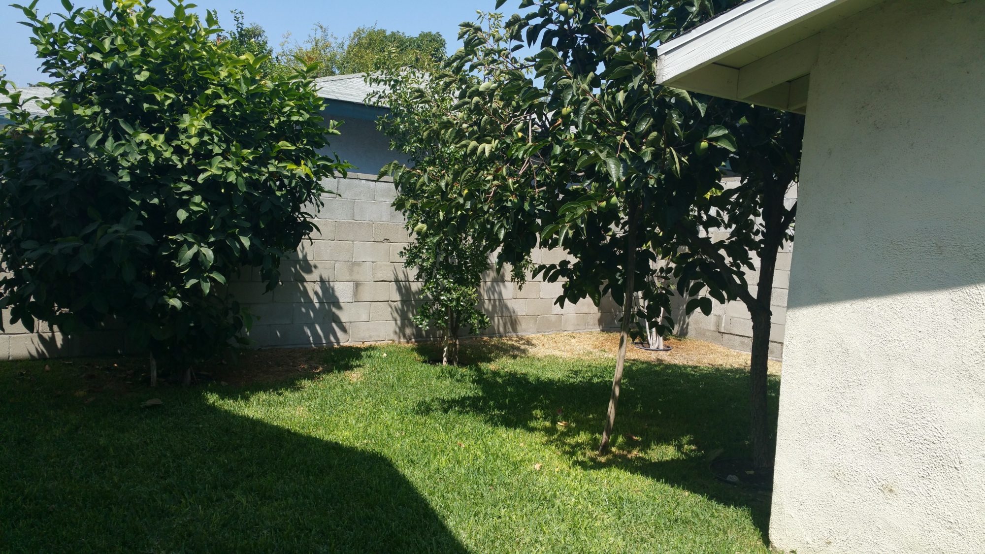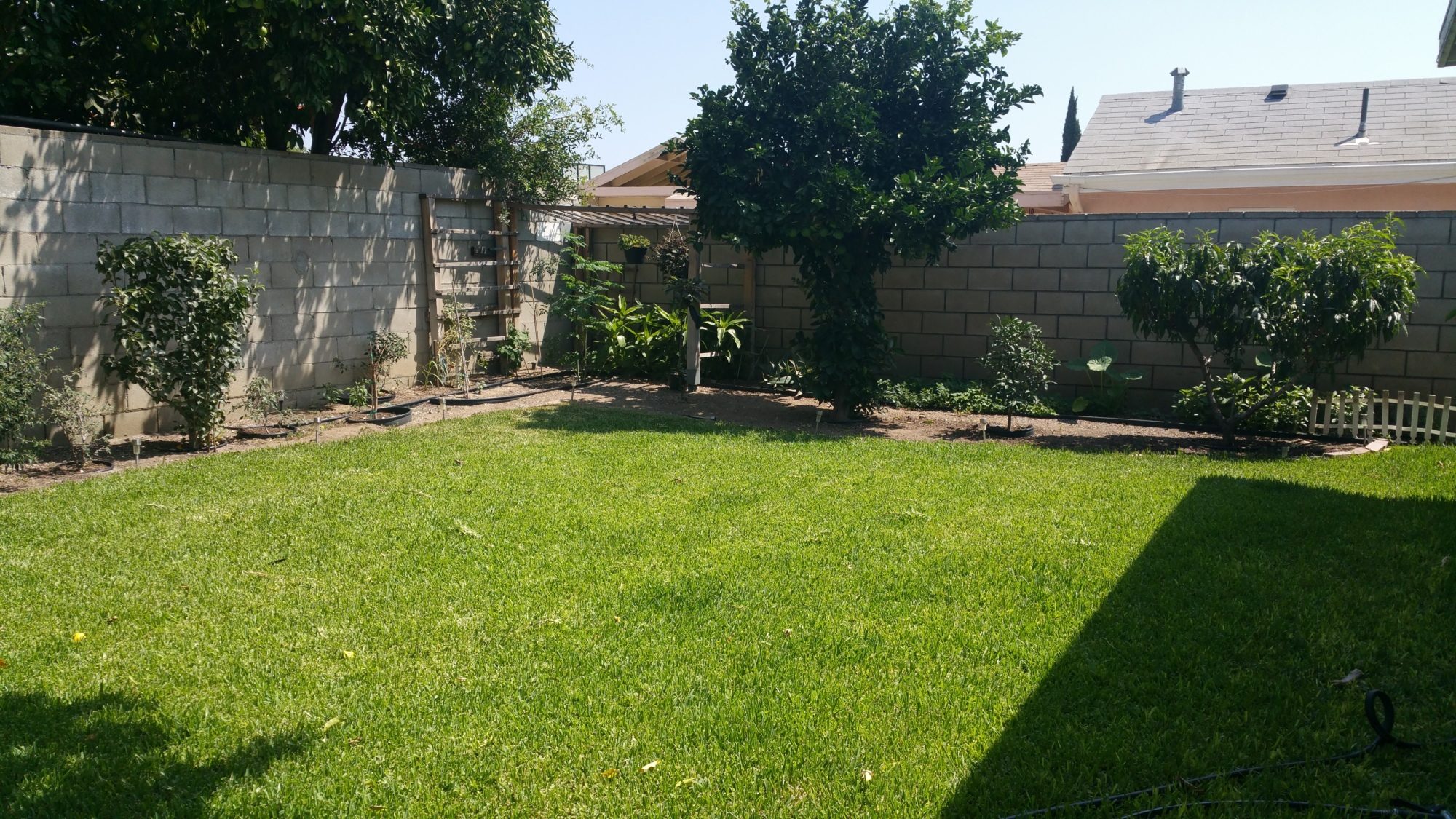 The small tree closest to us is a peach tree, after that is an orange tree. To the far left top corner is a papaya tree, two chili plants, and a kumquat plant/tree? Tomatoes are also there!